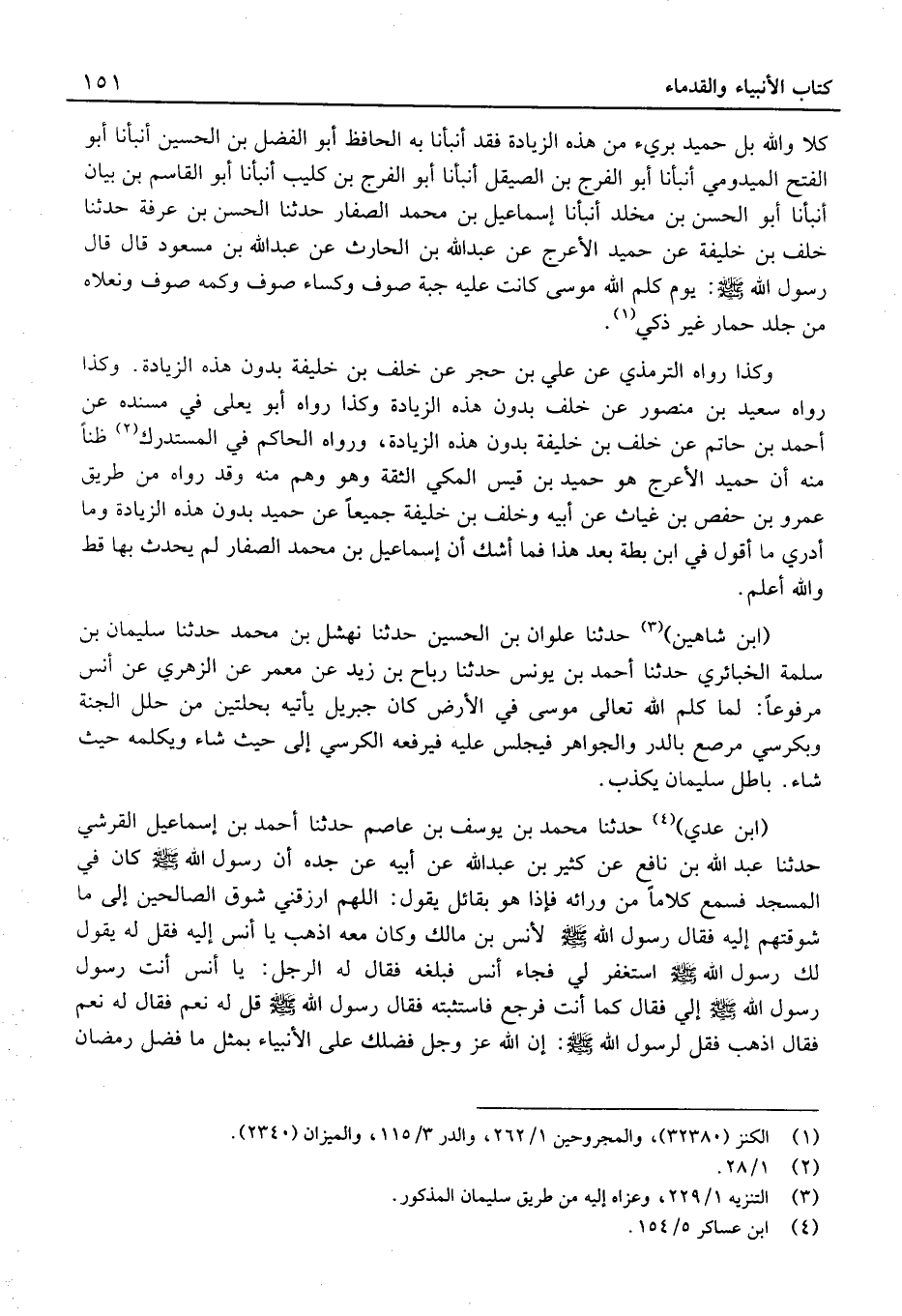 (ابْن شاهين) حَدَّثَنَا علوان بْن الْحُسَيْن حَدَّثَنَا نهشل بْن مُحَمَّد حَدَّثَنَا سُلَيْمَان بْن سَلمَة الخبائري حَدَّثَنَا أَحْمَد بْن يُونُس حَدَّثَنَا رَبَاح بْن زيد عَن معمر عَن الزُّهْرِيّ عَنْ أَنَسٍ مَرْفُوعا: لَمَّا كَلَّمَ اللَّهُ تَعَالَى مُوسَى فِي الأَرْضِ كَانَ جِبْرِيلُ يَأْتِيَهُ بِحُلَّتَيْنِ مِنْ حُلَلِ الْجَنَّةِ وَبِكُرْسِيٍّ مُرَصَّعٍ بِالدُّرِّ وَالْجَوَاهِرِ فَيَجْلِسُ عَلَيْهِ فَيَرْفَعُهُ الْكُرْسِيُّ إِلَى حَيْثُ شَاءَ وَيُكَلِّمُهُ حَيْثُ شَاءَ.