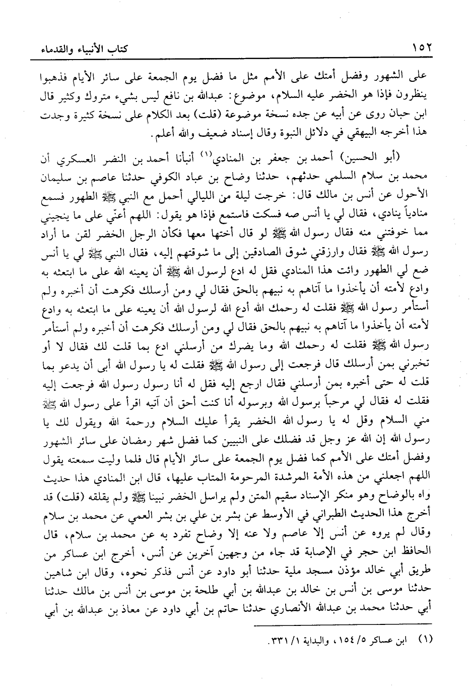 (أَبُو الْحُسَيْن) أَحْمد بن جَعْفَر بن الْمُنَادِي أَنْبَأنَا أَحْمَد بْن النَّضر العسكري أَن مُحَمَّد بْن سَلام السّلمِيّ حدَّثَهُمْ، حَدَّثَنَا وضَّاح بْن عبَّاد الْكُوفيّ حَدَّثَنَا عَاصِم بْن سُلَيْمَان الْأَحول عَنْ أَنَسِ بْنِ مَالِكٍ قَالَ: خَرَجْتُ لَيْلَةً مِنَ اللَّيَالِي أَحْمِلُ مَعَ النَّبِيِّ الطَّهُورَ فَسَمِعَ مُنَادِيًا يُنَادِي، فَقَالَ لِي يَا أَنَسُ صَهٍ فَسَكَتُّ فَاسْتَمَعَ فَإِذَا هُوَ يَقُولُ: اللَّهُمَّ أَعِنِّي عَلَى مَا يُنَجِّينِي مِمَّا خَوَّفْتَنِي مِنْهُ فَقَالَ رَسُولُ اللَّهِ لَوْ قَالَ أُخْتَهَا مَعَهَا فَكَانَ الرَّجُلُ الْخَضِرَ لَقِنَ مَا أَرَادَ رَسُول الله فَقَالَ وَارْزُقْنِي شَوْقَ الصَّادِقِينَ إِلَى مَا شَوَّقْتَهُمْ إِلَيْهِ، فَقَالَ النَّبِيُّ لِي يَا أَنَسُ ضَعْ لِي الطَّهُورَ وَائْتِ هَذَا الْمُنَادِي فَقُلْ لَهُ ادْع لرَسُول الله أَنْ يُعِينَهُ اللَّهُ عَلَى مَا ابْتَعَثَهُ بِهِ وَادْعُ لأُمَّتِهِ أَنْ يَأْخُذُوا مَا آتَاهُمْ بِهِ نَبِيُّهُمْ بِالْحَقِّ فَقَالَ لِي وَمَنْ أَرْسَلَكَ فَكَرِهْتُ أَنْ أُخْبِرَهُ وَلَمْ أَسْتَأْمِرْ رَسُول الله فَقُلْتُ لَهُ رَحِمَكَ اللَّهُ أدع الله لرَسُول الله أَن يُعينهُ عَلَى مَا ابْتَعَثَهُ بِهِ وَادْعُ لأُمَّتِهِ أَنْ يَأْخُذُوا مَا آتَاهُمْ بِهِ نَبِيُّهُمْ بِالْحَقِّ فَقَالَ لِي وَمَنْ أَرْسَلَكَ فَكَرِهْتُ أَنْ أُخْبِرَهُ وَلم أَستَأْمر رَسُول الله فَقلت لَهُ رَحِمك الله وَمَا يَضرك من أَرْسلنِي أدع بِمَا قلت لَك فَقَالَ لَا أَو تُخبرنِي بِمن أرسلك قَالَ فَرَجَعت إِلَى رَسُول الله فَقُلْتُ لَهُ يَا رَسُولَ اللَّهِ أَبَى أَنْ يَدْعُوَ بِمَا قُلْتَ لَهُ حَتَّى أُخْبِرَهُ بِمَنْ أَرْسَلَنِي فَقَالَ ارْجِعْ إِلَيْهِ فَقُلْ لَهُ أَنَا رَسُولُ رَسُولِ اللَّهِ فَرَجَعْتُ إِلَيْهِ فَقُلْتُ لَهُ فَقَالَ لِي مَرْحَبًا بِرَسُولِ اللَّهِ وَبِرَسُولِهِ أَنَا كُنْتُ أَحَقَّ أَنْ آتِيَهُ اقْرَأْ على رَسُول الله مِنِّي السَّلامَ وَقُلْ لَهُ يَا رَسُولَ اللَّهِ الْخَضِرُ يَقْرَأُ عَلَيْكَ السَّلامَ وَرَحْمَةَ اللَّهِ وَيَقُولُ لَكَ يَا رَسُولَ اللَّهِ إِنَّ اللَّهَ عَزَّ وَجَلَّ قَدْ فَضَّلَكَ عَلَى النَّبِيِّينَ كَمَا فَضَّلَ شَهْرَ رَمَضَانَ عَلَى سَائِرِ الشُّهُورِ وَفَضَّلَ أُمَّتَكَ عَلَى الأُمَمِ كَمَا فَضَّلَ يَوْمَ الْجُمُعَةِ عَلَى سَائِرِ الأَيَّامِ قَالَ فَلَمَّا وَلَّيْتُ سَمِعْتُهُ يَقُولُ اللَّهُمَّ اجْعَلْنِي مِنْ هَذِهِ الأُمَّةِ الْمُرْشَدَةِ الْمَرْحُومَةِ الْمُتَابِ عَلَيْهَا، قَالَ ابْن المنادى هَذَا حَدِيثٌ وَاهٍ بالوضاح وَهُوَ منكرُ الْإِسْنَاد سقيم الْمَتْن وَلم يراسل الْخضر نَبينَا ولَمْ يقلقه (قلت) قد أخرج هَذَا الحَدِيث الطَّبَرَانِيّ فِي الْأَوْسَط عَن بشر بْن عَلِيّ بْن بشر الْعمي عَن مُحَمَّد بْن سَلام وَقَالَ لَمْ يروه عَن أنس إِلَّا عَاصِم وَلَا عَنْهُ إِلَّا وضاح تفرد بِهِ عَن مُحَمَّد بْن سَلام، قَالَ الْحَافِظ ابْن حجر فِي الْإِصَابَة قد جَاءَ من وَجْهَيْن آخَرين عَن أنس، أخرج ابْن عَسَاكِر من طَرِيق أَبِي خَالِد مُؤذن مَسْجِد ملية حَدَّثَنَا أَبُو دَاوُد عَن أنس فَذكر نَحوه، وَقَالَ ابْن شاهين حَدَّثَنَا مُوسَى بْن أنس بْن خَالِد بْن عَبْد الله بْن أَبِي طَلْحَة بْن مُوسَى بْن أنس بْن مَالك حَدَّثَنَا أَبِي حَدَّثَنَا مُحَمَّد بْن عَبْد الله الْأنْصَارِيّ حَدَّثَنَا حاتِم بْن أَبِي دَاوُد عَن مُعاذ بْن عبد الله بن أبي