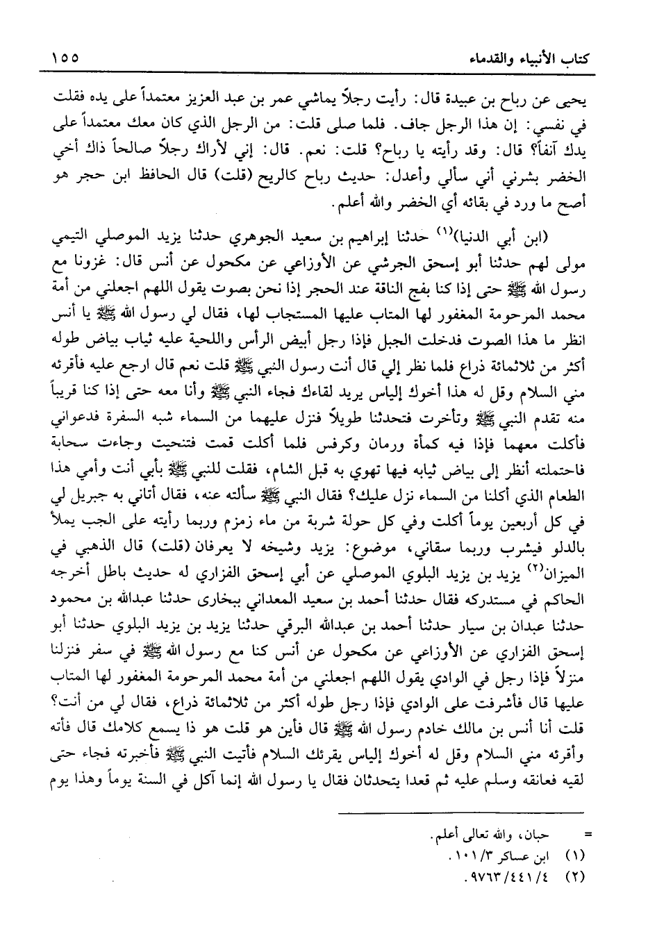 (ابْن أبي الدُّنْيَا) حَدَّثَنَا إِبْرَاهِيم بْن سَعِيد الْجَوْهَرِي حَدَّثَنَا يزِيد الْمَوْصِليّ التَّيْمِيّ مولى لَهم حَدَّثَنَا أَبُو إِسْحَاق الجرشِي عَن الْأَوْزَاعِيّ عَن مَكْحُول عَنْ أَنَسٍ قَالَ: غَزَوْنَا مَعَ رَسُولِ الله حَتَّى إِذَا كُنَّا بِفَجِّ النَّاقَةِ عِنْدَ الْحَجَرِ إِذَا نَحْنُ بِصَوْتٍ يَقُولُ اللَّهُمَّ اجْعَلْنِي مِنْ أُمَّةِ مُحَمَّدٍ الْمَرْحُومَةِ الْمَغْفُورِ لَهَا الْمُتَابِ عَلَيْهَا الْمُسْتَجَابِ لَهَا، فَقَالَ لِي رَسُول الله يَا أَنَسُ انْظُرْ مَا هَذَا الصَّوْتُ فَدَخَلْتُ الْجَبَلَ فَإِذَا رَجُلٌ أَبْيَضُ الرَّأْسِ وَاللِّحْيَةِ عَلَيْهِ ثِيَابٌ بَيَاض طوله أَكثر من ثَلَاثمِائَة ذِرَاعٍ فَلَمَّا نَظَرَ إِلَيَّ قَالَ أَنْت رَسُول النَّبِي قُلْتُ نَعَمْ قَالَ ارْجِعْ عَلَيْهِ فَأَقْرِئْهُ مِنِّي السَّلامَ وَقُلْ لَهُ هَذَا أَخُوكَ إِلْيَاسُ يُرِيدُ لِقَاءَكَ فجَاء النَّبِي وَأَنَا مَعَهُ حَتَّى إِذَا كُنَّا قَرِيبا مِنْهُ تقدم النَّبِي وَتَأَخَّرْتُ فَتَحَدَّثْنَا طَوِيلًا فَنَزَلَ عَلَيْهِمَا مِنَ السَّمَاءِ شِبْهُ السُّفْرَةِ فَدَعَوَانِي فَأَكَلْتُ مَعَهُمَا فَإِذَا فِيهِ كَمْأَةٌ وَرُمَّانٌ وَكَرَفْسٌ فَلَمَّا أَكَلْتُ قُمْتُ فتنحيت وَجَاءَت سَحَابَة فاحتملته أنظر إِلَى بَيَاضِ ثِيَابِهِ فِيهَا تَهْوِي بِهِ قِبَلَ الشَّامِ، فَقُلْتُ لِلنَّبِيِّ بِأَبِي أَنْت وَأُمِّي هَذَا الطَّعَامُ الَّذِي أكلنَا مِنَ السَّمَاءِ نَزَلَ عَلَيْكَ؟ فَقَالَ النَّبِي سَأَلْتُهُ عَنْهُ، فَقَالَ أَتَانِي بِهِ جِبْرِيلُ لِي فِي كُلِّ أَرْبَعِينَ يَوْمًا أَكَلْتُ وَفِي كُلِّ حَوْلٍة شَرْبَةٌ مِنْ مَاءِ زَمْزَمَ وَرُبَّمَا رَأَيْتُهُ عَلَى الْجُبِّ يَمْلأُ بِالدَّلْوِ فَيَشْرَبُ وَرُبَّمَا سَقَانِي، مَوْضُوع: يزِيد وَشَيْخه لَا يُعرفان (قلتُ) قَالَ الذَّهَبِيّ فِي الْمِيزَان يزِيد بْن يزِيد البلوي الْمَوْصِليّ عَن أَبِي إِسْحَاق الْفَزارِيّ لَهُ حَدِيث بَاطِل أَخْرَجَهُ الْحَاكِم فِي مُسْتَدْركه فَقَالَ حَدَّثَنَا أَحْمَد بْن سَعِيد المعداني ببخارى حَدَّثَنَا عَبْد الله بْن مَحْمُود حَدَّثَنَا عَبْدَانِ بْن سيار حَدَّثَنَا أَحْمَد بْن عَبْد الله البرقي حَدَّثَنَا يزِيد بْن يزِيد البلوي حَدَّثَنَا أَبُو إِسْحَاق الْفَزارِيّ عَن الْأَوْزَاعِيّ عَن مَكْحُول عَنْ أنس كُنَّا مَعَ رَسُول الله فِي سفر فنزلنا منزلا فَإِذا رَجُل فِي الْوَادي يَقُولُ اللَّهُمَّ اجْعَلْنِي مِنْ أُمَّةِ مُحَمَّدٍ الْمَرْحُومَةِ المغفور لَهَا المتاب عَلَيْهَا قَالَ فَأَشْرَفت عَلَى الْوَادي فَإِذا رَجُل طوله أَكثر من ثَلَاثمِائَة ذِرَاع، فَقَالَ لي من أَنْت؟ قلت أَنَا أنس بْن مَالك خَادِم رَسُول الله قَالَ فَأَيْنَ هُوَ قلتُ هُوَ ذَا يسمعُ كلامك قَالَ فأته وأقرئه مني السَّلَام وَقل لَهُ أخوكَ إلْيَاس يُقْرِئك السَّلَام فأتيتُ النَّبِي فَأَخْبَرته فجَاء حَتَّى لقِيه فعانقه وَسلم عَلَيْهِ ثُمَّ قعدا يتحدثان فَقَالَ يَا رَسُول الله إنّما آكل فِي السّنة يَوْمًا وَهَذَا يَوْم