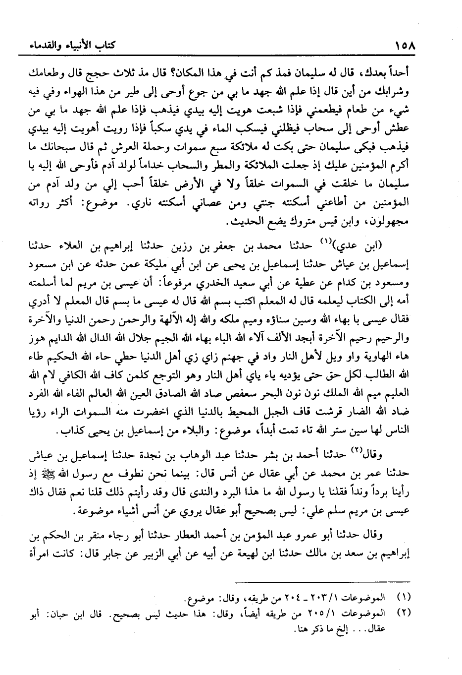 (ابْن عدي) حَدَّثَنَا مُحَمَّد بْن جَعْفَر بن رزين حَدَّثَنَا إِبْرَاهِيم بْن الْعَلَاء حَدَّثَنَا إِسْمَاعِيل بْن عَيَّاش حَدَّثَنَا إِسْمَاعِيل بْن يَحْيَى عَن ابْن أَبِي مليكَة عَمن حَدثهُ عَن ابْن مَسْعُود ومسعود بْن كدام عَن عَطِيَّة عَن أَبِي سَعِيدٍ الْخُدْرِيِّ مَرْفُوعا: أِنَّ عِيسَى بْنَ مَرْيَمَ لَمَّا أَسْلَمَتْهُ أُمُّهُ إِلَى الْكتاب لِيُعَلِّمَهُ قَالَ لَهُ الْمُعَلِّمُ اكْتُبْ بِسْمِ اللَّهِ قَالَ لَهُ عِيسَى مَا بِسْمِ قَالَ الْمُعَلِّمُ لَا أَدْرِي فَقَالَ عِيسَى بَا بَهَاءُ اللَّهِ وَسِينٌ سَنَاؤُهُ وَمِيمٌ مُلْكُهُ وَاللَّهُ إِلَهُ الآلِهَةِ وَالرَّحْمَنُ رَحْمَنُ الدُّنْيَا وَالآخِرَةِ وَالرَّحِيمُ رَحِيمُ الآخِرَةِ أَبْجَدْ الأَلِفُ آلاءُ اللَّهِ الْبَاءُ بَهَاءُ اللَّهِ الْجِيمُ جَلالُ اللَّهِ الدَّالُّ اللَّهُ الدَّايِمُ هَوَّزْ هَاءٌ الْهَاوِيَةُ وَاوٌ وَيْلٌ لأَهْلِ النَّارِ وَادٍ فِي جَهَنَّمَ زَايٌ زِيُّ أَهْلِ الدُّنْيَا حُطِّي حَاءٌ اللَّهُ الْحَكِيمُ طَاءٌ اللَّهُ الطَّالِبُ لِكُلِّ حَقٍّ حَتَّى يُؤَدِّيَهُ يَاءٌ يَايُ أَهْلِ النَّارِ وَهُوَ التَّوَجُّعُ كَلَمُنْ كَافٌّ اللَّهُ الْكَافِي لامُ اللَّهِ الْعَلِيمِ مِيمٌ اللَّهُ الْمَلِكُ نُونٌ نُونُ الْبَحْرِ سَعْفَصْ صَادٌ اللَّهُ الصَّادِقُ الْعَيْنُ اللَّهُ الْعَالِمُ الْفَاءُ اللَّهُ الْفَرْدُ ضَادٌ اللَّهُ الضَّارُّ قَرَشَتْ قَافٌ الْجَبَلُ الْمُحِيطُ بِالدُّنْيَا الَّذِي اخضرت مِنْهُ السَّمَوَات الرَّاءُ رُؤْيَا النَّاسِ لَهَا سِينٌ سِتْرُ اللَّهِ تَاءٌ تَمَّتْ أَبَدًا، مَوْضُوع: وَالْبَلَاء من إِسْمَاعِيل بْن يَحْيَى كَذَّاب.