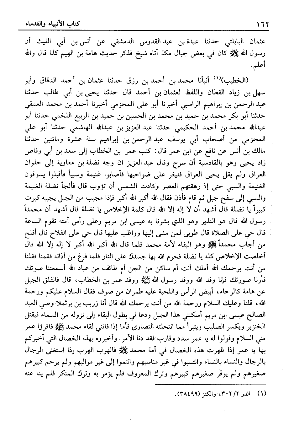 (الْخَطِيب) أَنْبَأنَا مُحَمَّد بْن أَحْمَد بْن رزق حَدَّثَنَا عُثْمَان بْن أَحْمَد الدقاق وَأَبُو سهل بْن زِيَاد الْقطَّان واللفظُ لعُثْمَان بْن أَحْمد قَالَ حَدَّثَنَا يَحْيَى بْن أبي طَالب حَدَّثَنَا عَبْد الرَّحْمَن بْن إِبْرَاهِيم الرَّاسِبِي أَخْبَرَنَا أَبُو عَليّ المحزمي أَخْبَرَنَا أَحْمَد بْن مُحَمَّد العتيقي حَدَّثَنَا أَبُو بَكْر مُحَمَّد بْن حميد بْن مُحَمَّد بْن الْحُسَيْن بْن حميد بْن الرّبيع اللَّخْمِيّ حَدَّثَنَا أَبُو عَبْد الله مُحَمَّد بْن أَحْمَد الحكيمي حَدَّثَنَا عَبْد الْعَزِيز بْن عَبْد الله الْهَاشِمِي حَدَّثَنَا أَبُو عَليّ المحزمي من أَصْحَاب أَبِي يُوسُف عَبْد الرَّحْمَن بْن إِبْرَاهِيم سنة عشرَة وَمِائَتَيْنِ حَدَّثَنَا مَالك بْن أنس عَن نَافِع عَنِ ابْنِ عُمَرَ قَالَ: كتب عُمَر بْن الْخَطَّاب إِلَى سعد بْن أَبِي وَقاص زَاد يَحْيَى وَهُوَ بالقادسية أَن سرح وَقَالَ عَبْد الْعَزِيز أَن وَجه نَضْلَة بْن مُعَاويَة إِلَى حلوان الْعرَاق ولَم يقل يَحْيَى الْعرَاق فليغر عَلَى ضواحيها فَأَصَابُوا غنيمَة وسبيًا فَأَقْبَلُوا يسوقون الْغَنِيمَة والسبي حَتَّى إِذْ رهقتهم الْعَصْر وكادت الشَّمْس أَن تؤوب قَالَ فألجأ نَضْلَة الْغَنِيمَة والسبي إِلَى سفح جبل ثمَّ قَالَ فَأذن فَقَالَ الله أكبر الله أكبر فَإِذا مُجيب من الْجَبَل يُجيبه كَبرت كَبِيرا يَا نَضْلَة قَالَ أشهدُ أَن لَا إِلَه إِلَّا الله قَالَ كلمة الْإِخْلَاص يَا نَضْلَة قَالَ أشهدُ أَن مُحَمَّدًا رَسُول الله قَالَ هُوَ النذير وَهُوَ الَّذِي بشرنا بِهِ عِيسَى ابْن مَرْيَم وعَلى رَأس أمته تقوم السَّاعَة قَالَ حَيّ عَلَى الصَّلَاة قَالَ طُوبَى لِمن مَشى إِلَيْهَا وواظب عَلَيْهَا قَالَ حَيّ عَلَى الْفَلاح قَالَ أفلحَ من أجَاب مُحَمَّدًا وَهُوَ الْبَقَاء لأمة مُحَمَّد فَلَمَّا قَالَ الله أكبر الله أكبر لَا إِلَه إِلَّا الله قَالَ أخلصت الْإِخْلَاص كُله يَا نَضْلَة فَحرم الله بِهَا جسدك عَلَى النَّار فَلَمَّا فرغ من أَذَانه فقمنا فَقُلْنَا من أَنْت يَرْحَمك الله أملك أَنْت أم سَاكن من الْجِنّ أم طائف من عباد الله أسمعتنا صَوْتك فأرنا صُورَتك فَإنَّا وفدُ الله ووفد رَسُول الله ووفد عُمَر بْن الْخَطَّاب، قَالَ فانفلق الجبلُ عَن هَامة كالرحاء، أَبيض الرَّأْس واللحية عَلَيْهِ طمران من صوف فَقَالَ السلامُ عَلَيْكُم وَرَحْمَة الله، قُلْنَا وَعَلَيْك السَّلَام وَرَحْمَة الله من أَنْت يَرْحَمك الله قَالَ أَنَا زريب بْن برثملا وَصِيّ العَبْد الصالِح عِيسَى ابْن مَرْيَم أسكنني هَذَا الْجَبَل ودعا لي بطول الْبَقَاء إِلَى نُزُوله من السَّمَاء فَيقْتل الْخِنْزِير ويكسرُ الصَّلِيب ويتبرأ مِمَّا انتحلته النَّصَارَى فَأَما إِذا فَاتَنِي لِقَاء مُحَمَّد فاقرؤا عُمَر مني السَّلَام وَقُولُوا لَهُ يَا عُمَر سدد وقارب فقد دنا الأمرُ.