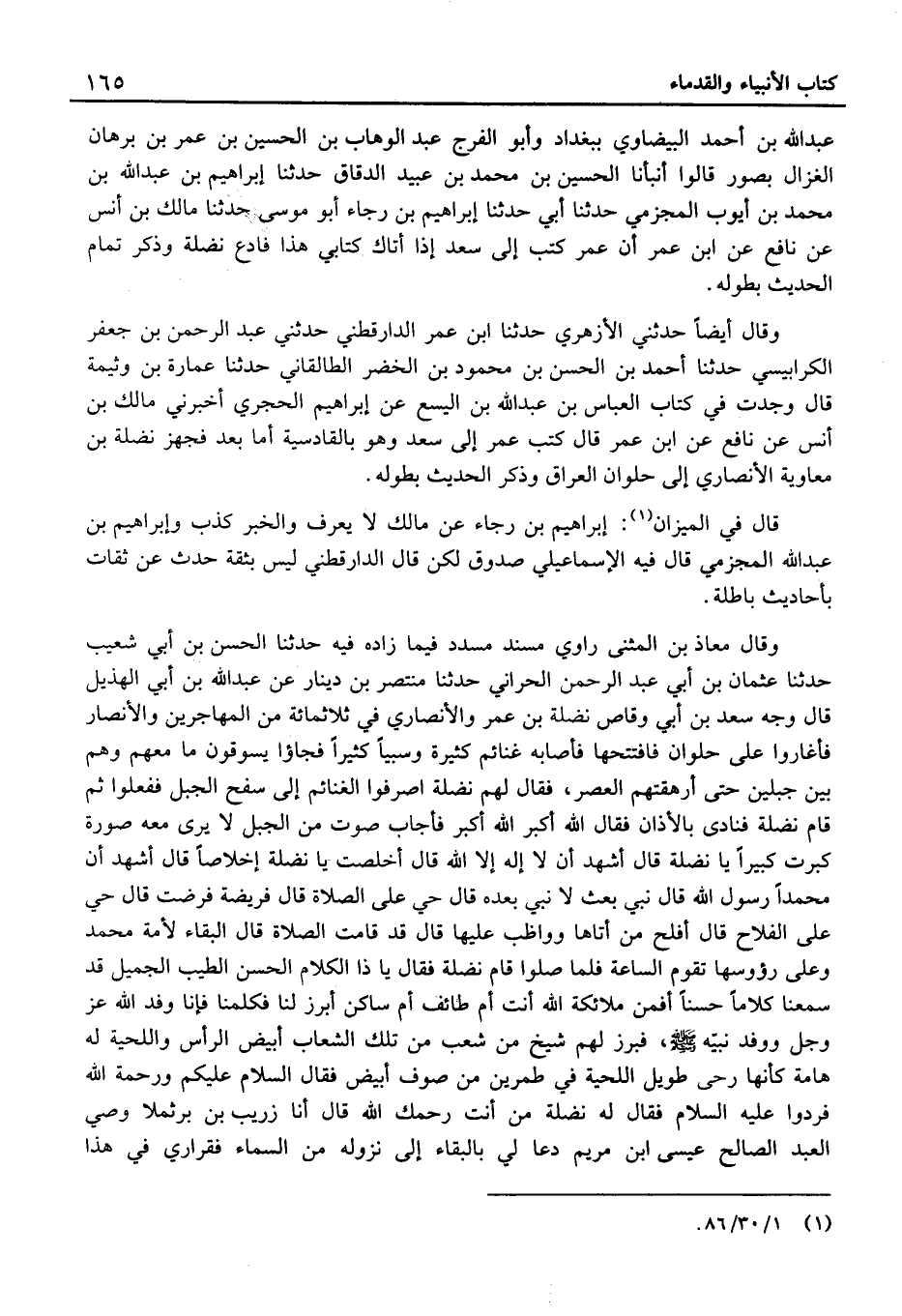 عَبْد الله بْن أَحْمَد الْبَيْضَاوِيّ بِبَغْدَاد وَأَبُو الْفرج عَبْد الْوَهَّاب بْن الْحُسَيْن بْن عُمَر بْن برهَان الغزال بصور قَالُوا أَنْبَأنَا الْحُسَيْن بْن مُحَمَّد بْن عُبَيْد الدقاق حَدَّثَنَا إِبْرَاهِيم بْن عَبْد الله بْن مُحَمَّد بْن أَيُّوب المجزمي حَدَّثَنَا أَبِي حَدَّثَنَا إِبْرَاهِيم بْن رَجَاء أَبُو مُوسَى حَدَّثَنَا مَالك بْن أنس عَن نَافِع عَن ابْن عُمَر أَن عُمَر كتب إِلَى سعد إِذا أتاكَ كتابي هَذَا فَادع نَضْلَة وَذكر تَمام الحَدِيث بِطُولِهِ.