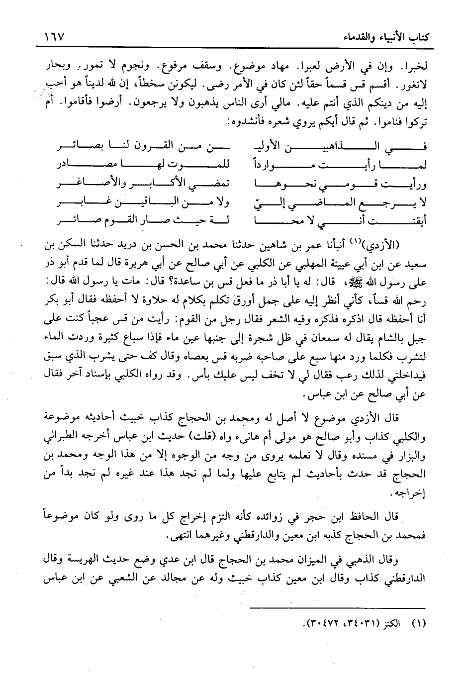 (الْأَزْدِيّ) أَنْبَأنَا عُمَر بْن شاهين حَدَّثَنَا مُحَمَّد بْن الْحَسَن بْن دُرَيْد حَدَّثَنَا السكن بْن سَعِيد عَن ابْن أَبِي عُيَيْنَة المهلبي عَن الْكَلْبِيّ عَن أَبِي صالِح عَن أَبِي هُرَيْرَةَ قَالَ لَمَّا قَدِمَ أَبُو ذَرٍّ عَلَى رَسُول الله، قَالَ: لَهُ يَا أَبَا ذَرٍّ مَا فَعَلَ قُسُّ بْنُ سَاعِدَةَ؟ قَالَ: مَاتَ يَا رَسُولَ اللَّهِ قَالَ: رَحِمَ اللَّهُ قُسًّا، كَأَنِّي أَنْظُرُ إِلَيْهِ عَلَى جَمَلٍ أَوْرَقَ تَكَلَّمَ بِكَلامٍ لَهُ حَلاوَةٌ لَا أَحْفَظُهُ فَقَالَ أَبُو بَكْرٍ أَنَا أَحْفَظُهُ قَالَ اذْكُرْهُ فَذَكَرَهُ وَفِيهِ الشَّعْرُ فَقَالَ رَجُلٌ مِنَ الْقَوْمِ: رَأَيْتُ مِنْ قُسٍّ عَجَبًا كُنْتُ عَلَى جَبَلٍ بِالشَّامِ يُقَالُ لَهُ سِمْعَانُ فِي ظِلِّ شَجَرَةٍ إِلَى جَنْبِهَا عَيْنُ مَاءٍ فَإِذَا سِبَاعٌ كَثِيرَةٌ وَرَدَتِ الْمَاءَ لِتَشْرَبَ فَكُلَّمَا وَرَدَ مِنْهَا سَبْعٌ عَلَى صَاحِبِهِ ضَرَبَهُ قُسٌّ بِعَصَاهُ وَقَالَ كُفَّ حَتَّى يَشْرَبَ الَّذِي سَبَقَ فَيُدَاخِلُنِي لِذَلِكَ رُعْبٌ فَقَالَ لِي لَا تَخَفْ لَيْسَ عَلَيْكَ بَأْسٌ.