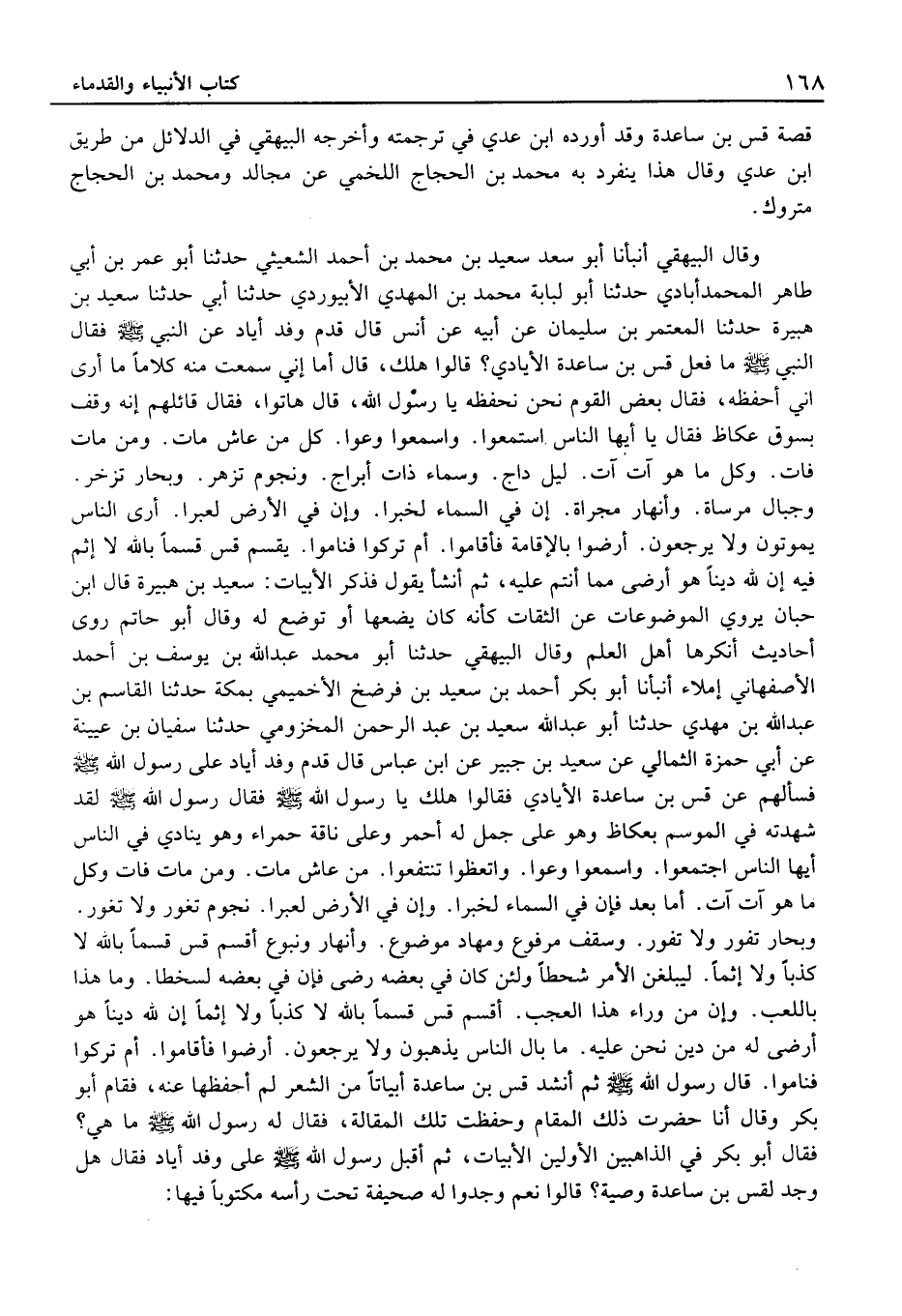 وَقَالَ الْبَيْهَقِيّ أَنْبَأنَا أَبُو سعد سَعِيد بْن مُحَمَّد بْن أَحْمَد الشعيثي حَدَّثَنَا أَبُو عُمَر بْن أَبِي طَاهِر المحمدابادي حَدَّثَنَا أَبُو لبَابَة مُحَمَّد بْن الْمهْدي الأبيوردي حَدَّثَنَا أَبِي حَدَّثَنَا سَعِيد بْن هُبَيْرَة حَدَّثَنَا الْمُعْتَمِر بْن سُلَيْمَان عَن أَبِيهِ عَنْ أَنَسٍ قَالَ قَدِمَ وَفْدُ إِيَادٍ عَنِ النَّبِيِّ فَقَالَ النَّبِي مَا فَعَلَ قُسُّ بْنُ سَاعِدَةَ الإِيَادِيُّ؟ قَالُوا هَلَكَ، قَالَ أَمَا إِنِّي سَمِعْتُ مِنْهُ كَلامًا مَا أَرَى أَنِّي أَحْفَظُهُ، فَقَالَ بَعْضُ الْقَوْمِ نَحْنُ نَحْفَظُهُ يَا رَسُولَ اللَّهِ، قَالَ هَاتُوا، فَقَالَ قَائِلُهُمْ إِنَّهُ وَقَفَ بِسُوقِ عُكَاظٍ فَقَالَ يَا أَيُّهَا النَّاسُ اسْتَمِعُوا.
