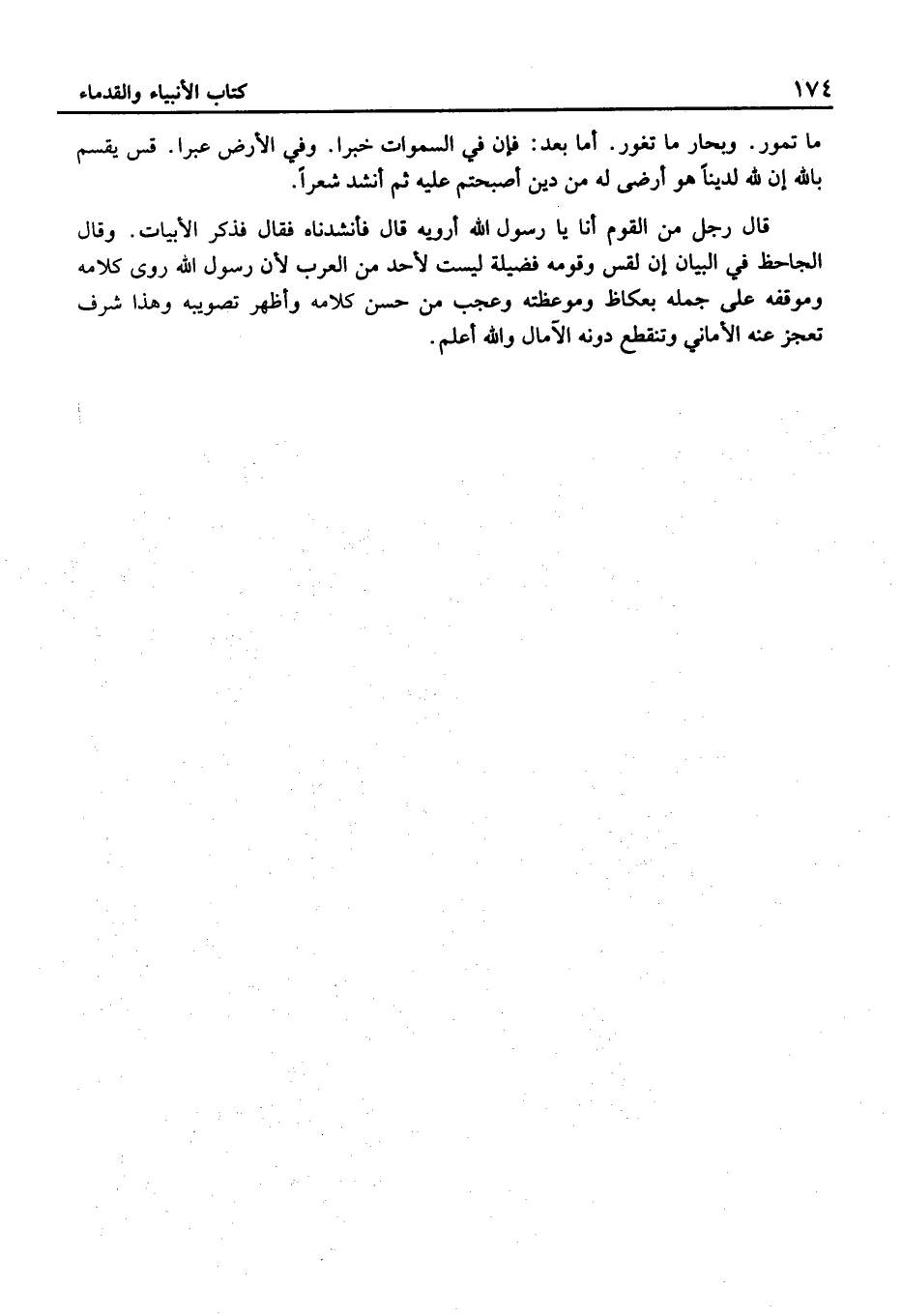 وَقَالَ الجاحظ فِي الْبَيَان إِن لقس وَقَومه فَضِيلَة لَيست لأحد من الْعَرَب لِأَن رَسُول الله روى كَلَامه وموقفه عَلَى جمله بعكاظ وموعظته وَعجب من حسن كَلَامه وأظهرَ تصويبه وَهَذَا شرف تعجز عَنْهُ الْأَمَانِي وتنقطعُ دونه الآمال وَالله أعلم.