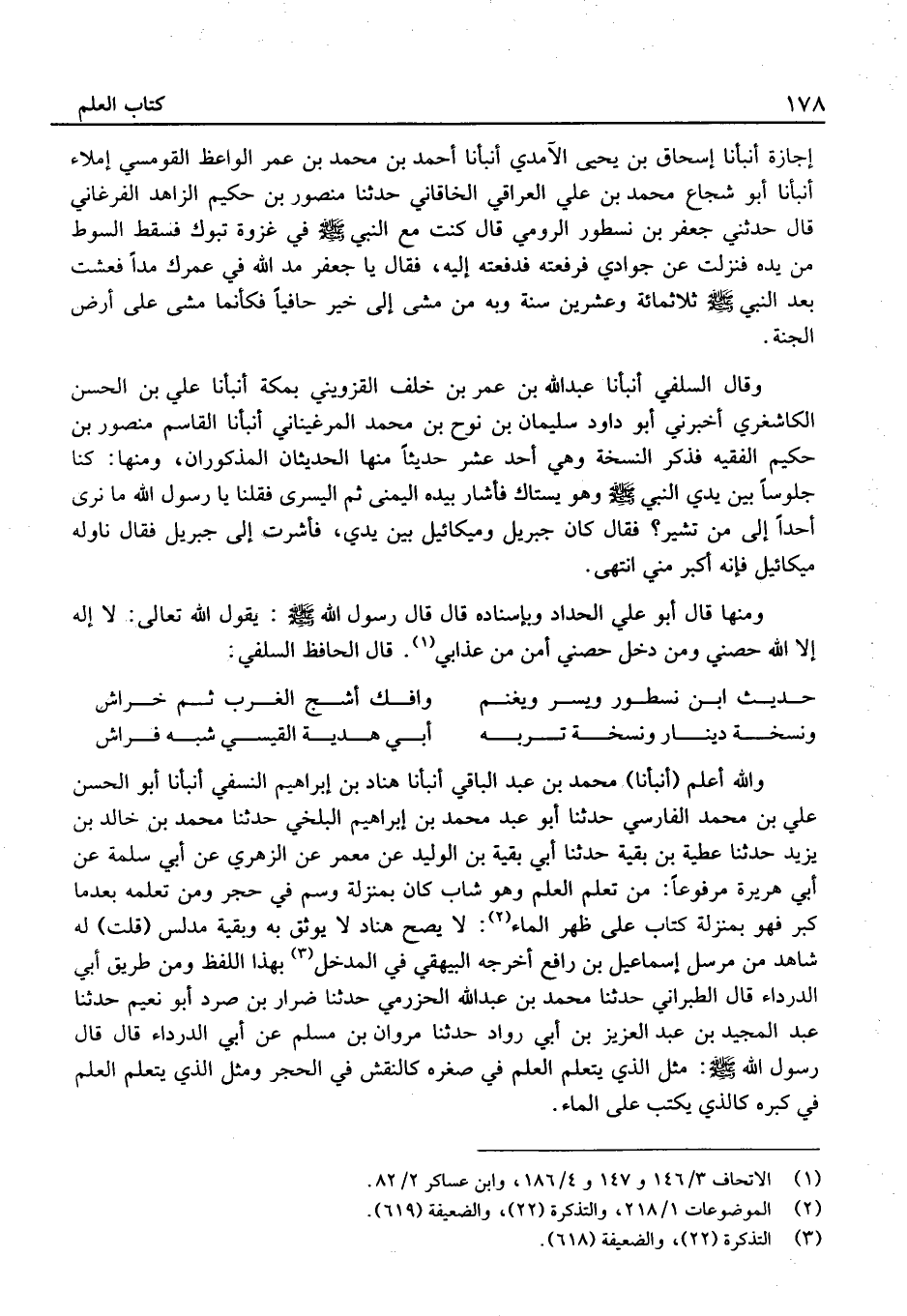 وَالله أعلم (أَنْبَأنَا) مُحَمَّد بْن عَبْد الْبَاقِي أَنْبَأنَا هناد بْن إِبْرَاهِيم النَّسَفِيّ أَنْبَأنَا أَبُو الْحَسَن عَلِيّ بْن مُحَمَّد الْفَارِسِي حَدَّثَنَا أَبُو عَبْد مُحَمَّد بْن إِبْرَاهِيم الْبَلْخِي حَدَّثَنَا مُحَمَّد بْن خَالِد بْن يزِيد حَدَّثَنَا عَطِيَّة بْن بَقِيَّة حَدَّثَنَا أَبِي بَقِيَّة بْن الْوَلِيد عَن معمر عَن الزُّهْرِيّ عَن أَبِي سَلمَة عَنْ أَبِي هُرَيْرَةَ مَرْفُوعا: مَنْ تَعَلَّمَ الْعِلْمَ وَهُوَ شَابٌّ كَانَ بِمَنْزِلَةِ وَسْمٍ فِي حَجَرٍ وَمَنْ تَعَلَّمَهُ بَعْدَمَا كَبُرَ فَهُوَ بِمَنْزِلَةِ كتاب عَلَى ظَهْرِ الْمَاءِ: لَا يَصِحُّ هناد لَا يوثق بِهِ وَبَقِيَّة مُدَلّس (قلتُ) لَهُ شَاهد من مُرْسل إِسْمَاعِيل بْن رَافع أَخْرَجَهُ الْبَيْهَقِيّ فِي الْمدْخل بِهذا اللَّفْظ وَمن طَرِيق أَبِي الدَّرْدَاء قَالَ الطَّبَرَانِيّ حَدَّثَنَا مُحَمَّد بْن عَبْد الله الحزرمي حَدَّثَنَا ضرار بْن صرد أَبُو نُعَيْم حَدَّثَنَا عَبْد الْمجِيد بْن عَبْد الْعَزِيز بْن أَبِي رواد حَدَّثَنَا مَرْوَان بْن مُسْلِم عَنْ أَبِي الدَّرْدَاء قَالَ قَالَ رَسُول الله: مَثَلُ الَّذِي يَتَعَلَّمُ الْعِلْمَ فِي صِغَرِهِ كَالنَّقْشِ فِي الْحَجَرِ وَمَثَلُ الَّذِي يَتَعَلَّمُ الْعِلْمَ فِي كِبَرِهِ كَالَّذي يكْتب على المَاء.
