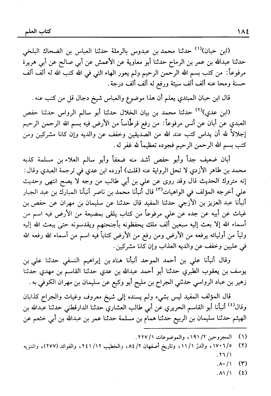 (ابْن حبَان) حَدَّثَنَا مُحَمَّد بْن عَبدُوس بالرملة حَدَّثَنَا الْعَبَّاس بْن الضَّحَّاك الْبَلْخِي حَدَّثَنَا عَبْد الله بْن عُمَر بْن الرماح حَدَّثَنَا أَبُو مُعَاويَة عَن الْأَعْمَش عَن أَبِي صالِح عَن أَبِي هُرَيْرَةَ مَرْفُوعا: مَنْ كَتَبَ بِسْمِ اللَّهِ الرَّحْمَنِ الرَّحِيمِ وَلَمْ يُعْوِرِ الْهَاءَ الَّتِي فِي اللَّهِ كَتَبَ اللَّهُ لَهُ أَلْفَ أَلْفِ حَسَنَةٍ وَمَحَا عَنْهُ أَلْفَ أَلْفِ سَيِّئَةٍ وَرَفَعَ لَهُ أَلْفَ أَلْفِ دَرَجَةٍ.
