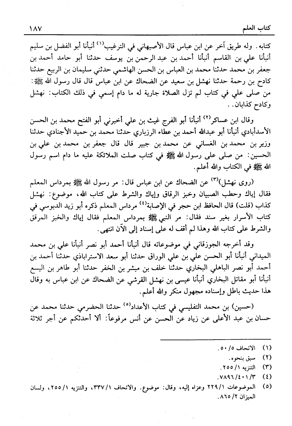 وَله طَرِيق آخر عَن ابْن عَبَّاس قَالَ الْأَصْبَهَانِيّ فِي التَّرْغِيب أَنْبَأنَا أَبُو الْفضل بْن سليم أَنْبَأنَا عَلِيّ بْن الْقَاسِم أَنْبَأنَا أَحْمَد بْن عَبْد الرَّحْمَن بْن يُوسُف حَدَّثَنَا أَبُو حَامِد أَحْمَد بْن جَعْفَر بْن مُحَمَّد حَدَّثَنَا مُحَمَّد بْن الْعَبَّاس بْن الْحَسَن الْهَاشِمِي حدَّثَنِي سُلَيْمَان بْن الرّبيع حَدَّثَنَا كَادِح بْن رَحْمَة حَدَّثَنَا نهشل بْن سَعِيد عَن الضَّحَّاك عَن ابْن عَبَّاس قَالَ قَالَ رَسُول الله: مَنْ صَلَّى عَلَيَّ فِي كتاب لَمْ تَزَلِ الصَّلاةُ جَارِيَةً لَهُ مَا دَامَ اسْمِي فِي ذَلِكَ الْكتاب: نَهْشَلٌ وَكَادِحٌ كَذَّابَانِ. .