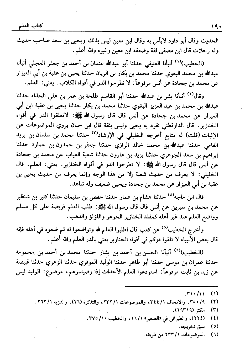 قَالَ ابْن مَاجَه حَدَّثَنَا هِشَام بْن عمار حَدَّثَنَا حَفْص بْن سُلَيْمَان حَدَّثَنَا كثير بْن شنظير عَن مُحَمَّد بْن سِيرِين عَنْ أَنَسٍ قَالَ قَالَ رَسُول الله: طَلَبَ الْعِلْمِ فَرِيضَةٌ عَلَى كُلِّ مُسْلِمٍ وَوَاضِعُ العِلْمٍ عِنْدَ غَيْرِ أَهْلِهِ كَمُقَلِّدِ الْخَنَازِيرِ الْجَوْهَرَ وَاللُّؤْلُؤَ وَالذَّهَبَ.