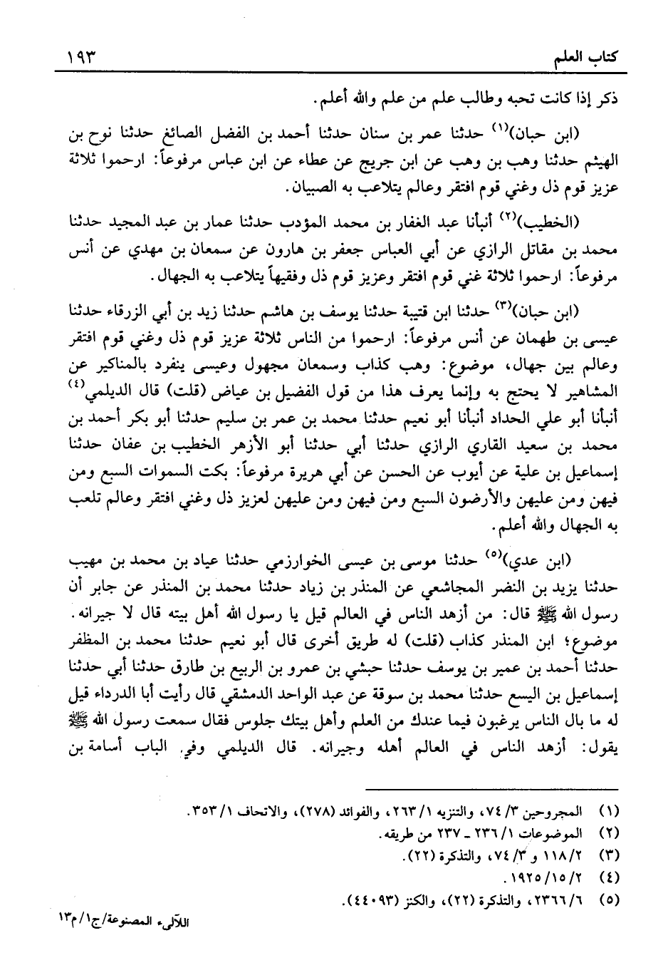 (ابْن حَبَّان) حَدَّثَنَا ابْن قُتَيْبَة حَدَّثَنَا يُوسُف بْن هَاشم حَدَّثَنَا زيد بْن أَبِي الزَّرْقَاء حَدَّثَنَا عِيسَى بْن طهْمَان عَن أنس مَرْفُوعا: ارْحَمُوا مِنَ النَّاسِ ثَلاثَةً عَزِيزُ قَوْمٍ ذَلَّ وَغَنِيُّ قَوْمٍ افْتَقَرَ وَعَالِمٌ بَيْنَ جُهَّالٍ، مَوْضُوع: وهب كَذَّاب وسمعان مَجْهُول وَعِيسَى ينفردُ بِالْمَنَاكِيرِ عَن الْمَشَاهِير لَا يحْتَج بِهِ وإنَّما يعرف هَذَا من قَول الفضيل بْن عِيَاض (قلتُ) قَالَ الديلمي أَنْبَأنَا أَبُو عَليّ الْحداد أَنْبَأنَا أَبُو نُعَيْم حَدَّثَنَا مُحَمَّد بْن عُمَر بْن سليم حَدَّثَنَا أَبُو بَكْر أَحْمَد بْن مُحَمَّد بْن سَعِيد الْقَارِي الرَّازِيّ حَدَّثَنَا أَبِي حَدَّثَنَا أَبُو الْأَزْهَر الْخَطِيب بْن عَفَّان حَدَّثَنَا إِسْمَاعِيل بْن علية عَن أَيُّوب عَن الْحَسَن عَن أَبِي هُرَيْرَةَ مَرْفُوعا: بَكت السَّمَوَات السَّبْعُ وَمَنْ فِيهِنَّ وَمَنْ عَلَيْهِنَّ وَالأَرَضُونَ السَّبْعُ وَمَنْ فِيهِنَّ وَمَنْ عَلَيْهِنَّ لِعَزِيزٍ ذَلَّ وَغَنِيٍّ افْتَقَرَ وَعَالِمٍ تَلْعَبُ بِهِ الْجُهَّالُ وَالله أعلم.