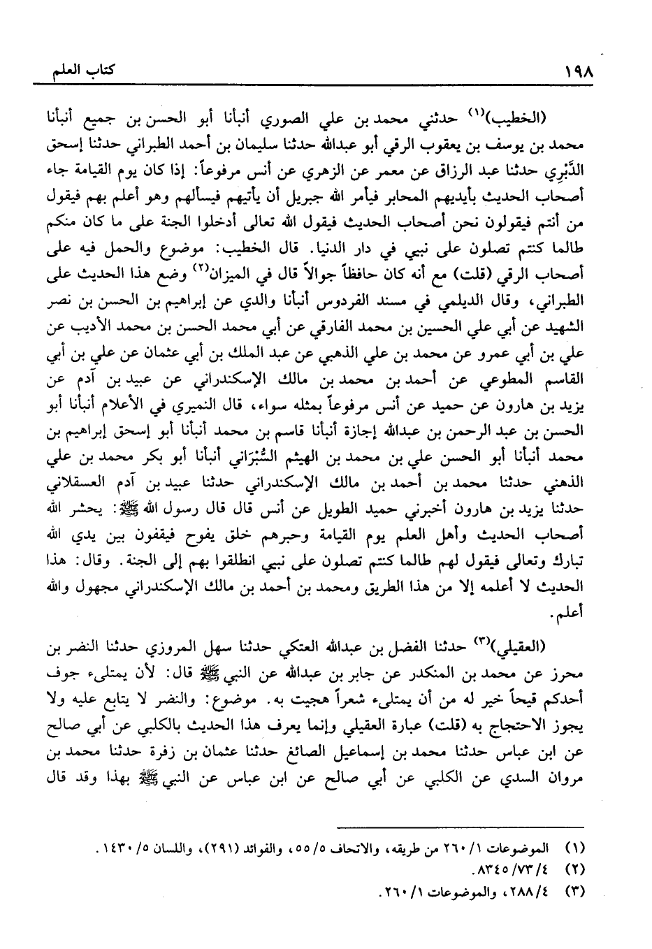 قَالَ الْخَطِيب: مَوْضُوع وَالْحمل فِيهِ عَلَى أَصْحَاب الرقي (قلت) مَعَ أَنَّهُ كَانَ حَافِظًا جوالاً قَالَ فِي الْمِيزَان وضع هَذَا الحَدِيث عَلَى الطَّبَرَانِيّ، وَقَالَ الديلمي فِي مُسْند الفردوس أَنْبَأنَا وَالِدي عَن إِبْرَاهِيم بْن الْحَسَن بْن نصر الشَّهِيد عَن أَبِي عَليّ الْحُسَيْن بْن مُحَمَّد الفارقي عَن أَبِي مُحَمَّد الْحَسَن بن مُحَمَّد الأديب عَن عَلِيّ بْن أَبِي عَمْرو عَن مُحَمَّد بْن عَليّ الذَّهَبِيّ عَن عَبْد الْملك بْن أَبِي عُثْمَان عَن عَلِيّ بْن أَبِي الْقَاسِم المطوعي عَن أَحْمَد بْن مُحَمَّد بْن مَالك الإسْكَنْدراني عَن عُبَيْد بْن آدم عَن يزِيد بْن هَارُون عَن حميد عَن أَنَسٍ مَرْفُوعًا بِمثله سَوَاء، قَالَ النميري فِي الْأَعْلَام أَنْبَأنَا أَبُو الْحَسَن بْن عَبْد الرَّحْمَن بْن عَبْد الله إجَازَة أَنْبَأنَا قَاسم بْن مُحَمَّد أَنْبَأنَا أَبُو إِسْحَاق إِبْرَاهِيم بْن مُحَمَّد أَنْبَأنَا أَبُو الْحَسَن عَلِيّ بْن مُحَمَّد بْن الْهَيْثَم السبراني أَنْبَأنَا أَبُو بَكْر مُحَمَّد بْن عَليّ الذهْنِي حَدَّثَنَا مُحَمَّد بْن أَحْمَد بْن مَالك الإسْكَنْدراني حَدَّثَنَا عُبَيْد بْن آدم الْعَسْقَلَانِي حَدَّثَنَا يزِيد بْن هَارُون أَخْبرنِي حميد الطَّوِيل عَنْ أَنَسٍ قَالَ قَالَ رَسُول الله: يَحْشُرُ اللَّهُ أَصْحَابَ الْحَدِيثِ وَأَهْلَ الْعِلْمِ يَوْمَ الْقِيَامَةِ وَحِبْرُهُمْ خلق يَفُوحُ فَيَقِفُونَ بَيْنَ يَدَيِ اللَّهِ تَبَارَكَ وَتَعَالَى فَيَقُولُ لَهُمْ طَالَمَا كُنْتُمْ تُصَلُّونَ عَلَى نَبِيِّي انْطَلِقُوا بهم إِلَى الْجَنَّةِ.