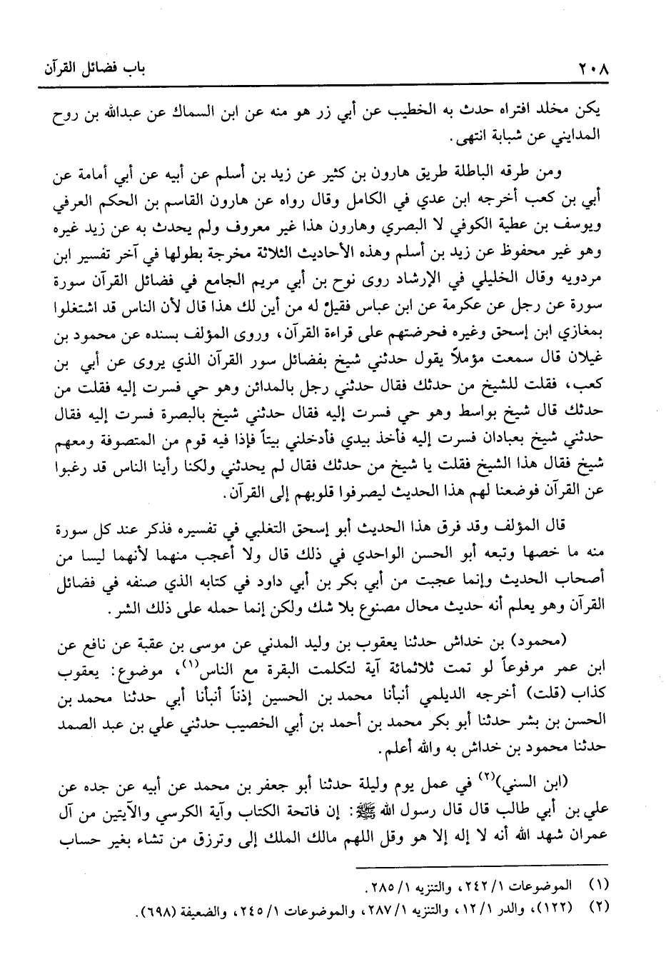 وَمن طرقه الْبَاطِلَة طَرِيق هَارُون بْن كثير عَن زيد بْن أسلم عَن أَبِيهِ عَن أبي أُمَامَة عَن أبي بْن كَعْب أَخْرَجَهُ ابْن عدي فِي الْكَامِل وَقَالَ رواهُ عَن هَارُون الْقَاسِم بْن الحكم الْعرفِيّ ويوسف بْن عَطِيَّة الْكُوفيّ لَا الْبَصْرِيّ وَهَارُون هَذَا غير مَعْرُوف وَلم يحدث بِهِ عَن زيد غَيره وَهُوَ غير مَحْفُوظ عَن زيد بْن أسلم وَهَذِه الْأَحَادِيث الثَّلَاثَة مخرجة بِطُولِهَا فِي آخر تَفْسِير ابْن مرْدَوَيْه وَقَالَ الخليلي فِي الْإِرْشَاد روى نوح بْن أبي مَرْيَم الْجَامِع فِي فَضَائِل الْقُرْآن سُورَة سُورَة عَن رجلٍ عَن عِكْرِمَة عَن ابْن عَبَّاس فَقيل لَهُ من أَيْنَ لَك هَذَا قَالَ لِأَن النَّاس قد اشتغلوا بمغازي ابْن إِسْحَاق وَغَيره فحرضتهم على قِرَاءَة الْقُرْآن، وروى الْمُؤلف بِسَنَدِهِ عَن مَحْمُود بْن غيلَان قَالَ سمعتُ مؤملاً يَقُولُ حدَّثَنِي شيخ بفضائل سور الْقُرْآن الَّذِي يرْوى عَن أبي بْن كَعْب، فقلتُ للشَّيْخ من حَدثَك فَقَالَ حدَّثَنِي رجلٌ بِالْمَدَائِنِ وَهُوَ حَيّ فسرتُ إِلَيْهِ فقلتُ من حَدثَك قَالَ شيخٌ بواسط وَهُوَ حَيّ فسرت إِلَيْهِ فَقَالَ حدَّثَنِي شيخٌ بِالْبَصْرَةِ فسرت إِلَيْهِ فَقَالَ حدَّثَنِي شيخ بعبادان فسرتُ إِلَيْهِ فَأخذ بيَدي فَأَدْخلنِي بَيْتا فَإِذا فِيهِ قومٌ من المتصوفة وَمَعَهُمْ شيخٌ فَقَالَ هَذَا الشَّيْخ فقلتُ يَا شيخ من حَدثَك فَقَالَ لم يحدثني وَلَكنَّا رَأينَا النَّاس قد رَغِبُوا عَن الْقُرْآن فَوَضَعْنَا لَهُم هَذَا الحَدِيث ليصرفوا قلوبَهم إِلَى الْقُرْآن.