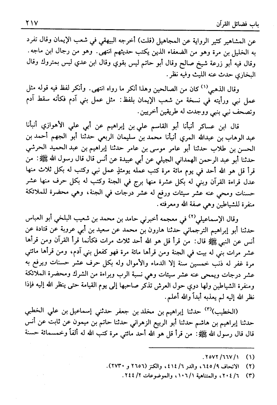 وَقَالَ الْإِسْمَاعِيلِيّ فِي مُعْجَمه أَخْبرنِي حَامِد بْن مُحَمَّد بْن شُعَيْب الْبَلْخِي أَبُو الْعَبَّاس حَدَّثَنَا أَبُو إِبْرَاهِيم الترجماني حَدَّثَنَا هَارُون بْن مُحَمَّد عَن سَعِيد بْن أَبِي عرُوبَة عَن قَتَادَة عَن أنس عَن النَّبِي قَالَ: مَنْ قَرَأَ {قُلْ هُوَ اللَّهُ أَحَدٌ} ثَلاثَ مَرَّاتٍ فَكَأَنَّمَا قَرَأَ الْقُرْآنَ وَمَنْ قَرَأَهَا عَشْرَ مَرَّاتٍ بُنِيَ لَهُ بَيْتٌ فِي الْجَنَّةِ وَمَنْ قَرَأَهَا مِائَةَ مَرَّةٍ فَهُوَ كَفِعْلِ بَنِيِ آدَمَ، وَمَنْ قَرَأَهَا مِائَتَيْ مَرَّةٍ غُفِرَ لَهُ ذَنْبُ خَمْسِينَ سَنَةً إِلا الدِّمَاءَ وَالأَمْوَالَ وَلَهُ بِكُلِّ حَرْفٍ عَشْرُ حَسَنَاتٍ وَيُرْفَعُ بِهِ عَشْرَ دَرَجَاتٍ وَيُمْحَى عَنْهُ عَشْرُ سَيِّئَاتٍ وَهِيَ نِسْبَةُ الرَّبِّ وَبَرَاءَةٌ مِنَ الشِّرْكِ وَمُحْضِرَةٌ الْمَلائِكَةَ وَمُنَفِّرَةٌ الشَّيَاطِينَ وَلَهَا دَوِيٌّ حَوْلَ الْعَرْشِ تُذَكِّرُ صَاحِبَهَا إِلَى يَوْمِ الْقِيَامَةِ حَتَّى يَنْظُرَ اللَّهُ إِلَيْهِ فَإِذَا نَظَرَ اللَّهُ إِلَيْهِ لَمْ يُعَذِّبْهُ أَبَدًا وَالله أعلم.