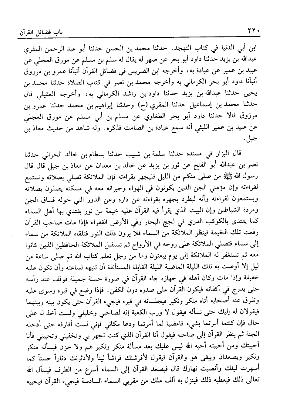 قَالَ الْبَزَّار فِي مُسْنده حَدَّثَنَا سَلمَة بْن شبيب حَدَّثَنَا بسطَام بْن خَالِد الْحَرَّانِي حَدَّثَنَا نصر بْن عَبْد الله أَبُو الْفَتْح عَن ثَوْر بْن يزِيد عَن خَالِد بْن معدان عَن مُعَاذِ بْنِ جَبَلٍ قَالَ قَالَ رَسُول الله مَنْ صَلَّى مِنْكُمْ مِنَ اللَّيْلِ فَلْيَجْهَرْ بِقِرَاءَتِهِ فَإِنَّ الْمَلائِكَةَ تُصَلَّى بِصَلاتِهِ وَتَسْتَمِعُ لِقِرَاءَتِهِ وَإِن مؤمني الْجِنّ الَّذين يكونُونَ فِي الْهَوَاء وجيرانه مَعَه فِي مَسْكَنه يصلونَ بِصَلَاتِهِ ويستمعون لقرَاءَته وَإِنَّهُ لَيَطْرُدُ بِجَهْرِهِ بِقِرَاءَتِهِ عَنْ دَارِهِ وَعَنِ الدُّورِ الَّتِي حَوْلَهُ فُسَّاقَ الْجِنِّ وَمَرَدَةَ الشَّيَاطِينِ وَإِنَّ الْبَيْتَ الَّذِي يُقْرَأُ فِيهِ الْقُرْآنُ عَلَيْهِ خَيْمَةٌ مِنْ نُورٍ يَقْتَدِي بِهَا أَهْلُ السَّمَاءِ كَمَا يُقْتَدَى بِالْكَوْكَبِ الدُّرِّيِّ فِي لُجَجِ الْبِحَارِ وَفِي الأَرْضِ الْقَفْرَاءِ فَإِذَا مَاتَ صَاحِبُ الْقُرْآنِ رُفِعَتْ تِلْكَ الْخَيْمَةُ فَيَنْظُرُ الْمَلائِكَةُ مِنَ السَّمَاءِ فَلا يَرَوْنَ ذَلِكَ النُّورَ فَتَلَقَّاهُ الْمَلائِكَةُ مِنْ سَمَاءٍ إِلَى سَمَاءٍ فَتُصَلِّي الْمَلائِكَةُ عَلَى رُوحِهِ فِي الأَرْوَاحِ ثُمَّ تَسْتَقْبِلُ الْمَلائِكَةُ الْحَافِظِينَ الَّذِينَ كَانُوا مَعَهُ ثُمَّ تَسْتَغْفِرُ لَهُ الْمَلائِكَةُ إِلَى يَوْمِ يُبْعَثُونَ وَمَا مِنْ رَجُلٍ تَعَلَّمَ كتاب اللَّهِ ثُمَّ صَلَّى سَاعَةً مِنْ لَيْلٍ إِلا أَوْصَتْ بِهِ تِلْكَ اللَّيْلَةُ الْمَاضِيَةُ اللَّيْلَة الْقَابِلَةَ الْمُسْتَأْنَفَةَ أَنْ تُنَبِّهَهُ لِسَاعَتِهِ وَأَنْ تَكُونَ عَلَيْهِ خَفِيفَةً وَإِذَا مَاتَ وَكَانَ أَهْلُهُ فِي جِهَازِهِ جَاءَ الْقُرْآنُ فِي صُورَةٍ حَسَنَةٍ جَمِيلَةٍ فَوَقَفَ عِنْدَ رَأْسِهِ حَتَّى يُدْرَجَ فِي أَكْفَانِهِ فَيَكُونُ الْقُرْآنُ عَلَى صَدْرِهِ دُونَ الْكَفَنِ.