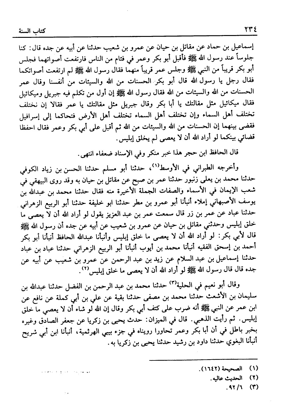 إِسْمَاعِيل بْن حَمَّاد عَن مقَاتل بْن حَيَّان عَنْ عَمْرِو بْنِ شُعَيْب حَدثنَا عَن أَبِيهِ عَن جدِّه قَالَ: كُنَّا جُلُوسًا عِنْدَ رَسُولِ اللَّهِ فَأَقْبَلَ أَبُو بَكْرٍ وَعُمَرُ فِي فِئَامٍ مِنَ النَّاسِ فَارْتَفَعَتْ أَصْوَاتُهُمَا فَجَلَسَ أَبُو بَكْرٍ قَرِيبًا مِنَ النَّبِي وَجَلَسَ عُمَرُ قَرِيبًا مِنْهُمَا فَقَالَ رَسُول الله لِمَ ارْتَفَعَتْ أَصْوَاتُكُمَا فَقَالَ رَجُلٌ يَا رَسُولَ اللَّهِ قَالَ أَبُو بَكْرٍ الْحَسَنَاتُ مِنَ اللَّهِ وَالسَّيِّئَاتُ مِنْ أَنْفُسِنَا وَقَالَ عُمَرُ الْحَسَنَاتُ مِنَ اللَّهِ وَالسَّيِّئَاتُ مِنَ اللَّهِ فَقَالَ رَسُول الله إِنَّ أَوَّلَ مَنْ تَكَلَّمَ فِيهِ جِبْرِيلُ وَمِيكَائِيلُ فَقَالَ مِيكَائِيلُ مِثْلَ مَقَالَتِكَ يَا أَبَا بَكْرٍ وَقَالَ جِبْرِيلُ مِثْلَ مَقَالَتِكَ يَا عُمَرُ فَقَالا إِنْ نَخْتَلِفْ تَخْتَلِفْ أَهْلُ السَّمَاءِ وَإِنْ تَخْتَلِفْ أَهْلُ السَّمَاءِ تَخْتَلِفْ أَهْلُ الأَرْضِ فَتَحَاكَمَا إِلَى إِسْرَافِيلَ فَقَضَى بَيْنَهُمَا إِنَّ الْحَسَنَاتِ مِنَ اللَّهِ وَالسَّيِّئَاتُ مِنَ اللَّهِ ثُمَّ أَقْبَلَ عَلَى أَبِي بَكْرٍ وَعمر فَقَالَا احْفَظَا قَضَائِي بَيْنَكُمَا لَوْ أَرَادَ اللَّهُ أَنْ لَا يُعْصَى لَمْ يَخْلُقْ إِبْلِيسَ.