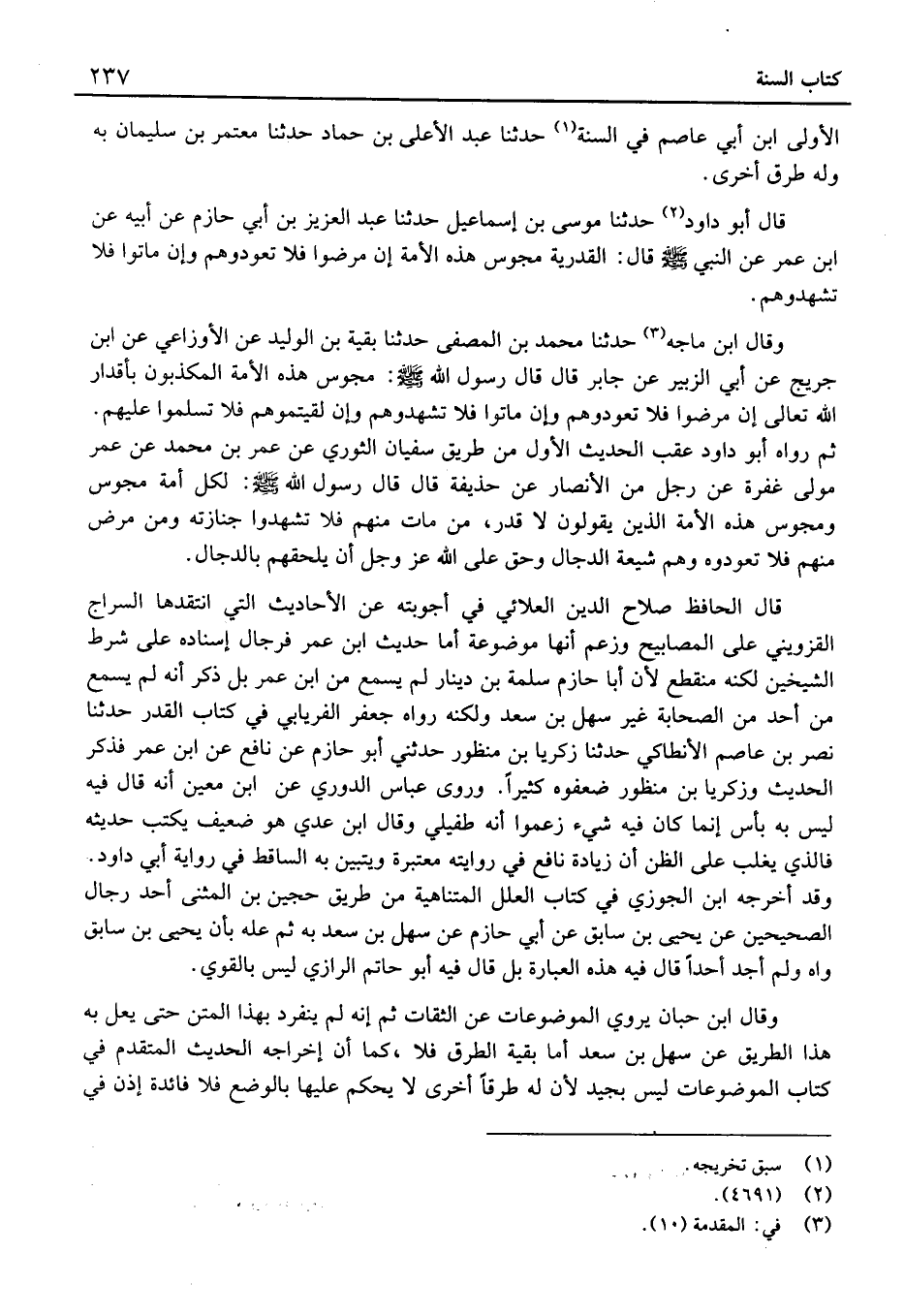قَالَ الْحَافِظ صَلَاح الدَّين العلائي فِي أجوبته عَن الْأَحَادِيث الَّتِي انتقدها السراج الْقزْوِينِي عَلَى المصابيح وَزعم أنَّها مَوْضُوعَة أمَّا حَدِيث ابْن عُمَر فرجال إِسْنَاده عَلَى شَرط الشَّيْخَيْنِ لكنه منقطعٌ لِأَن أَبَا حَازِم سَلمَة بْن دِينَار لَمْ يسمع من ابْن عُمَر بل ذكر أَنَّهُ لَمْ يسمع من أحد من الصَّحَابَة غير سهل بْن سعد وَلكنه رَوَاهُ جَعْفَر الْفرْيَابِيّ فِي كتاب الْقدر حَدَّثَنَا نصر بْن عَاصِم الْأَنْطَاكِي حَدَّثَنَا زَكَرِيَّا بْن مَنْظُور حدَّثَنِي أَبُو حَازِم عَن نَافِع عَن ابْن عُمَر فَذكر الحَدِيث وزَكَرِيا بْن مَنْظُور ضعفّوه كثيرا.