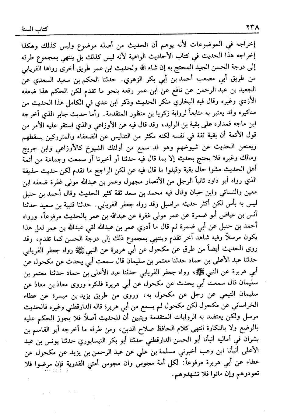 حَدَّثَنَا قُتَيْبَة بْن سَعِيد حَدَّثَنَا أنس بْن عِيَاض أَبُو ضَمرَة عَن عُمَر مولى غفرة عَن عَبْد الله بْن عُمَر بِالْحَدِيثِ مَرْفُوعا، ورواهُ أَحْمَد بْن حَنْبَل عَن أبي ضَمرَة ثُمّ قَالَ مَا أَدْرِي عُمَر بْن عَبْد الله لَقِي عَبْد الله بْن عُمَر لَعَلَّ هَذَا يكون مُرْسلا وَفِيه شَاهد آخر تقدم وَيَنْتَهِي بِمجموع ذَلِكَ إِلَى دَرَجَة الْحَسَن كَمَا تقدم، وَقد روى الحَدِيث أَيْضا من طرق عَن مَكْحُول عَنْ أَبِي هُرَيْرَةَ عَن النَّبِي رواهُ جَعْفَر الْفرْيَابِيّ حَدَّثَنَا عَبْد الْأَعْلَى بْن حَمَّاد حَدَّثَنَا مُعْتَمر بْن سُلَيْمَان قَالَ سمعتُ أبي يُحدث عَن مَكْحُول عَن أبي هُرَيْرَة عَن النَّبِي، رواهُ جَعْفَر الْفرْيَابِيّ حَدَّثَنَا عَبْد الْأَعْلَى بْن حَمَّاد حَدَّثَنَا مُعْتَمر بْن سُلَيْمَان قَالَ سمعتُ أبي يُحدث عَن مَكْحُول عَن أبي هُرَيْرَة فَذكره وروى معَاذ بْن معَاذ عَن سُلَيْمَان التَّيْمِيّ عَن رَجُل عَن مَكْحُول بِهِ، وَرُوِيَ من طَرِيق يزِيد بْن ميسرَة عَن عَطاء الْخُرَاسَانِي عَن مَكْحُول لَكِن مَكْحُول لَمْ يسمع من أبي هُرَيْرَةَ قَالَه الدَّارَقُطْنِيّ وَغَيره فَالْحَدِيث مُرْسل وَلَكِن يعتضد بِهِ الرِّوَايَات الْمُتَقَدّمَة ويتبين أَن للْحَدِيث أصلا فَلَا يجوز الحكم عَلَيْهِ بِالْوَضْعِ وَلَا بالنكارة انْتهى كَلَام الْحَافِظ صَلَاح الدَّين، وَمن طرقه مَا أَخْرَجَهُ أَبُو الْقَاسِم بْن بَشرَان فِي أَمَالِيهِ أَنْبَأنَا أَبُو الْحَسَن الدَّارَقُطْنِيّ حَدَّثَنَا أَبُو بَكْر النَّيْسَابُورِي حَدَّثَنَا يُونُس بْن عَبْد الْأَعْلَى أَنْبَأنَا ابْن وهب أَخْبرنِي مسلمة بْن عَليّ عَن عَبْد الرَّحْمَن بْن يزِيد عَن مَكْحُول عَن عَطاء عَنْ أَبِي هُرَيْرَةَ مَرْفُوعا: لِكُلِّ أُمَّةٍ مَجُوسٌ وَأَنَّ مَجُوسَ أُمَّتِي الْقَدَرِيَّةُ فَإِنْ مَرِضُوا فَلا تَعُودُوهُمْ وَإِنْ مَاتُوا فَلا تشهدوهم.