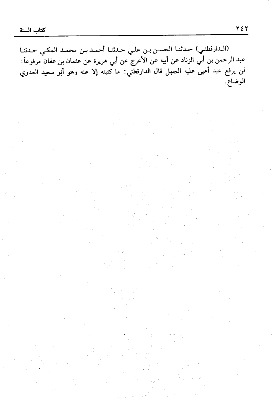 (الدَّارَقُطْنِيّ) حَدَّثَنَا الْحَسَن بْن عَليّ حَدَّثَنَا أَحْمَد بْن مُحَمَّد الْمَكِّيّ حَدَّثَنَا عَبْد الرَّحْمَن بْن أَبِي الزِّنَاد عَن أَبِيهِ عَن الْأَعْرَج عَن أبي هُرَيْرَةَ عَنْ عُثْمَانَ بْنِ عَفَّانَ مَرْفُوعا: لَنْ يُرْفَعَ عَبْدٌ أَعْيَى عَلَيْهِ الْجَهْلُ قَالَ الدَّارَقُطْنِيّ: مَا كتبته إِلَّا عَنْهُ وَهُوَ أَبُو سعيد الْعَدوي الوضاع.