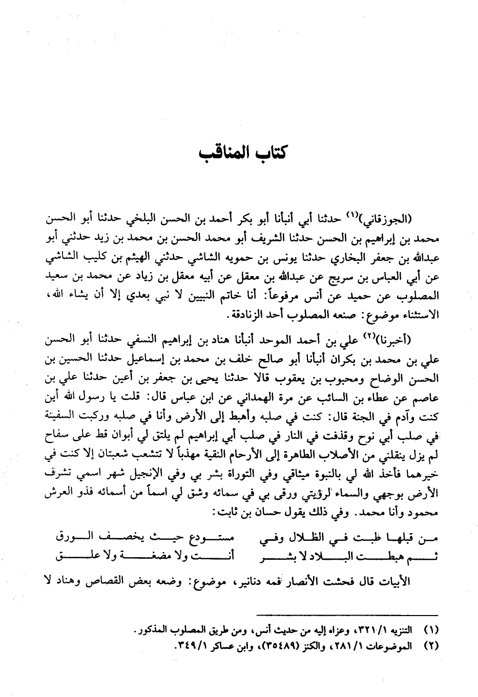 (الجوزقاني) حَدَّثَنَا أبي أَنْبَأنَا أَبُو بَكْر أَحْمَد بْن الْحَسَن الْبَلْخِي حَدَّثَنَا أَبُو الْحَسَن مُحَمَّد بْن إِبْرَاهِيم بْن الْحَسَن حَدَّثَنَا الشريف أَبُو مُحَمَّد الْحَسَن بْن مُحَمَّد بْن زيد حدَّثَنِي أَبُو عَبْد الله بْن جَعْفَر الْبُخَاريّ حَدَّثَنَا يُونُس بْن حمويه الشَّاشِي حَدثنِي الْهَيْثَم بْن كُلَيْب الشَّاشِي عَن أبي الْعَبَّاس ين سُرَيج عَن عَبْد الله بْن معقل عَن أَبِيهِ معقل بْن زِيَاد عَن مُحَمَّد بْن سَعِيد المصلوب عَن حميد عَنْ أَنَسٍ مَرْفُوعا: أَنَا خَاتَمُ النَّبِيِّينَ لَا نَبِيَّ بَعْدِي إِلا أَنْ يَشَاءَ اللَّهُ، الاسْتِثْنَاءُ مَوْضُوع: صنعه المصلوب أحد الزَّنَادِقَة.