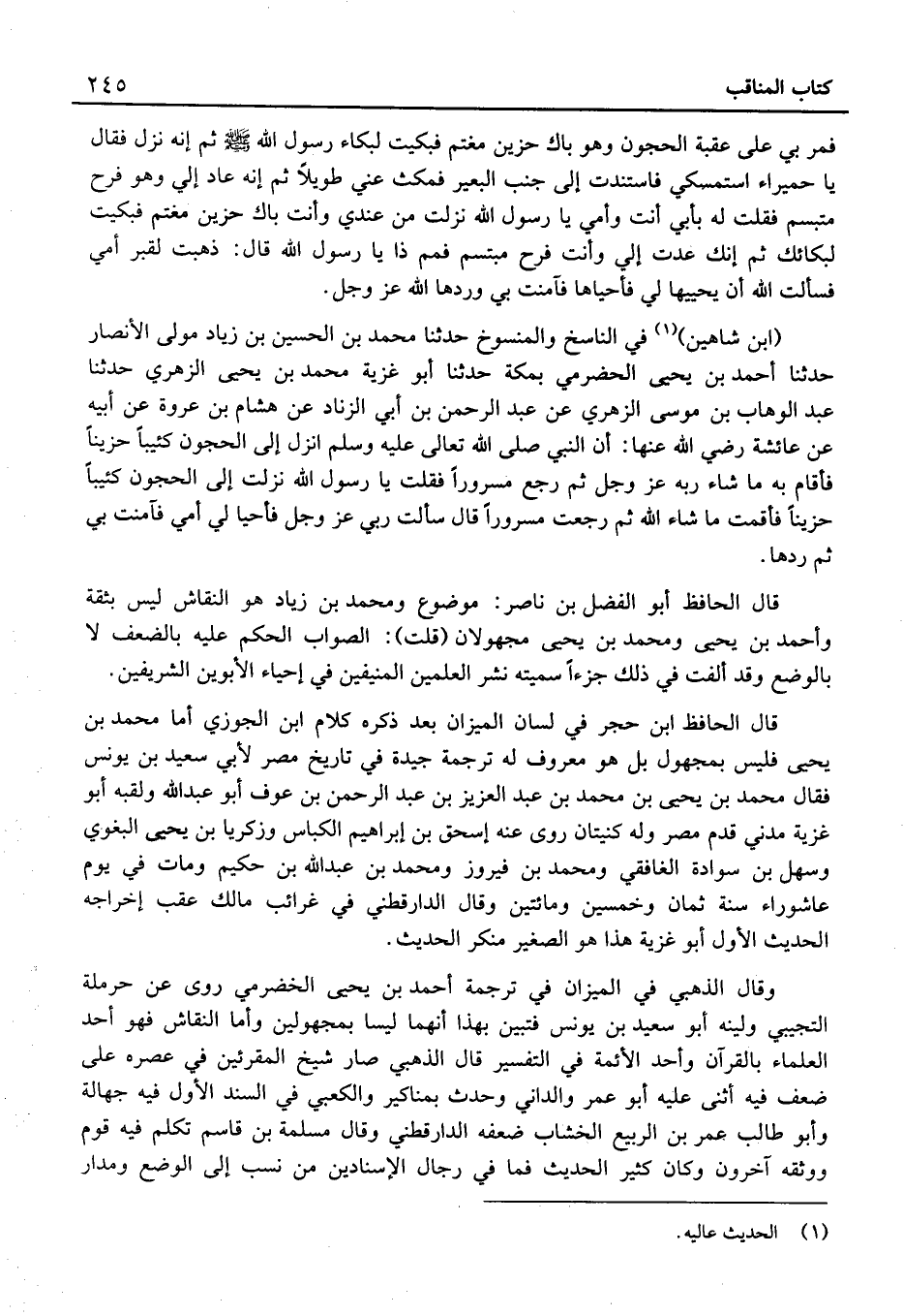 (ابْن شاهين) فِي النَّاسِخ والمنسوخ حَدَّثَنَا مُحَمَّد بْن الْحُسَيْن بْن زِيَاد مولى الْأَنْصَار حَدَّثَنَا أَحْمَد بْن يَحْيَى الْحَضْرَمِيّ بِمكة حَدَّثَنَا أَبُو غزيَّة مُحَمَّد بْن يَحْيَى الزُّهْرِيّ حَدَّثَنَا عَبْد الْوَهَّاب بْن مُوسَى الزُّهْرِيّ عَن عَبْد الرَّحْمَن بْن أبي الزِّنَاد عَن هِشَام بْن عُرْوَة عَن أَبِيهِ عَن عَائِشَةَ رَضِيَ اللَّهُ عَنْهَا: أَنّ النَّبِيَّ أنزل إِلَى الْحَجُونِ كَئِيبًا حَزِينًا فَأَقَامَ بِهِ مَا شَاءَ رَبُّهُ عَزَّ وَجَلَّ ثُمَّ رَجَعَ مَسْرُورًا فَقُلْتُ يَا رَسُولَ اللَّهِ نَزَلْتَ إِلَى الْحَجُونِ كَئِيبًا حَزِينًا فَأَقَمْتَ مَا شَاءَ اللَّهُ ثُمَّ رَجَعْتَ مَسْرُورًا قَالَ سَأَلْتُ رَبِّي عَزَّ وَجَلَّ فَأَحْيَا لِي أُمِّي فَآمَنَتْ بِي ثُمَّ رَدَّهَا.