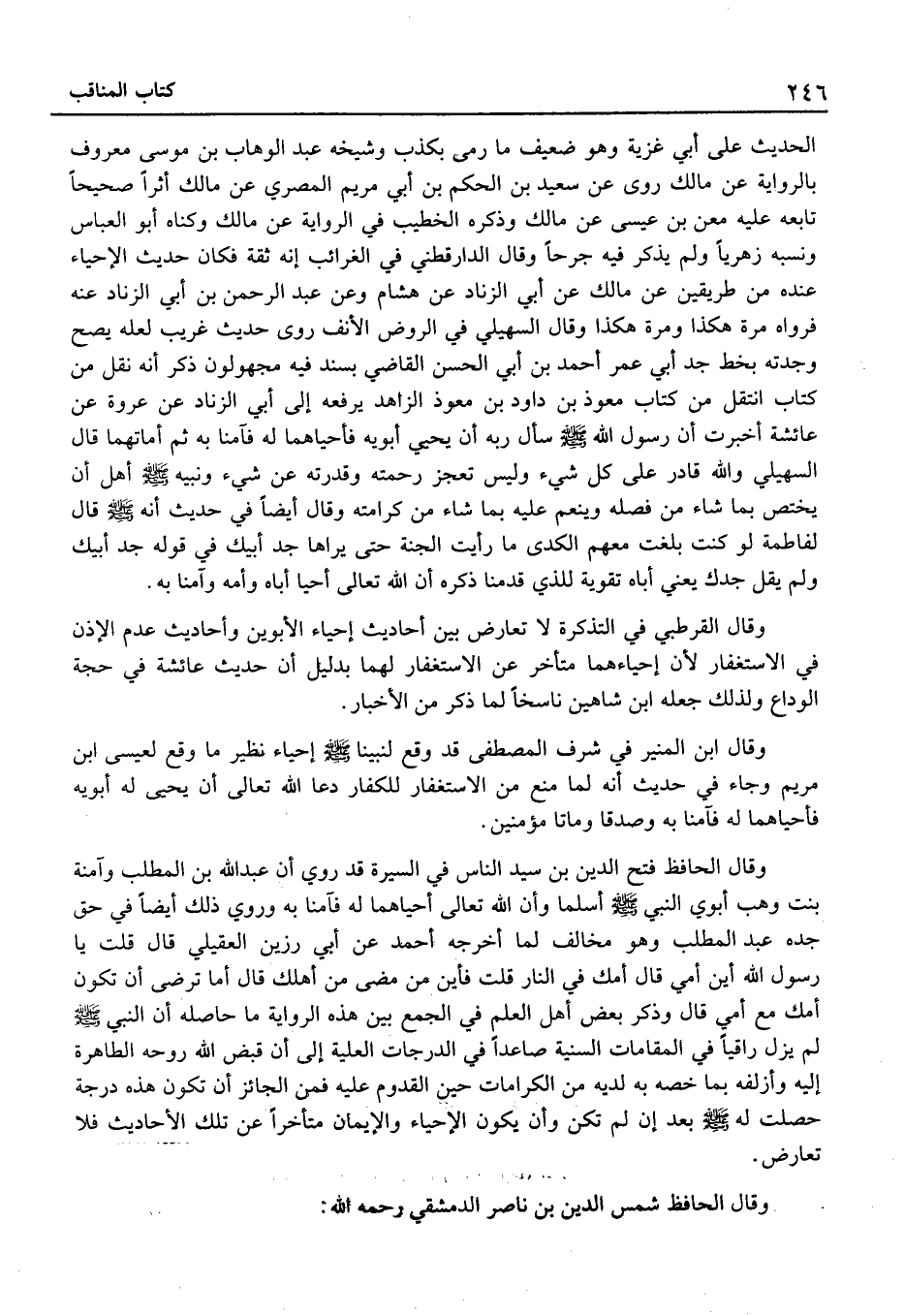 وَقَالَ الْحَافِظ فتح الدَّين بْن سيد النَّاس فِي السِّيرَة قد رُوِيَ أَن عَبْد الله بْن الْمطلب وآمنة بِنْت وهب أَبَوي النَّبِيّ أسلما وَأَن الله تَعَالَى أحياهما لَهُ فَآمَنا بِهِ وَرُوِيَ ذَلِكَ أَيْضا فِي حق جده عَبْد الْمطلب وَهُوَ مُخَالف لِما أَخْرَجَهُ أَحْمَد عَن أبي رزين الْعقيلِيّ قَالَ قلتُ يَا رَسُول الله أَيْنَ أُمِّي قَالَ أمك فِي النَّار قلتُ فَأَيْنَ من مضى من أهلك قَالَ أما ترْضى أَن تكون أمك مَعَ أُمِّي قَالَ وَذكر بعض أهلُ الْعلم فِي الْجمع بَين هَذِه الرِّوَايَة مَا حَاصله أَن النَّبِي لَمْ يزل راقيًا فِي المقامات السّنيَّة صاعدًا فِي الدَّرَجَات الْعلية إِلَى أَن قبض الله روحه الطاهرة إِلَيْهِ وأزلفه بِما خصَّه بِهِ لَدَيْهِ من الكرامات حِين الْقدوم عَلَيْهِ فَمن الْجَائِز أَن تكون هَذِه دَرَجَة حصلت لَهُ بعد إِن لَمْ تكن وَأَن يكون الْإِحْيَاء وَالْإِيمَان مُتَأَخِّرًا عَن تِلْكَ الْأَحَادِيث فَلَا تعَارض.