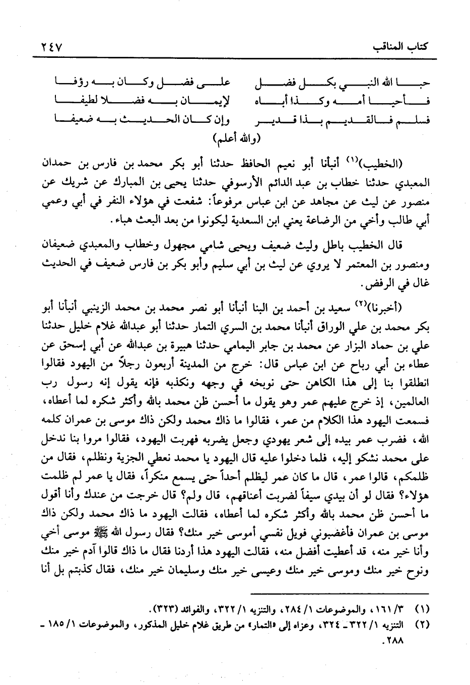 (أَخْبَرَنَا) سَعِيد بْن أَحْمَد بْن الْبَنَّا أَنْبَأنَا أَبُو نصر مُحَمَّد بْن مُحَمَّد الزَّيْنَبِي أَنْبَأنَا أَبُو بَكْر مُحَمَّد بْن عَليّ الْوراق أَنْبَأنَا مُحَمَّد بْن السّري التَّمار حَدَّثَنَا أَبُو عَبْد الله غُلَام خَلِيل حَدَّثَنَا عَلِيّ بْن حَمَّاد الْبَزَّار عَن مُحَمَّد بْن جَابِر اليمامي حَدَّثَنَا هُبَيْرَة بْن عَبْد الله عَن أبي إِسْحَاق عَن عَطاء بْن أَبِي رَبَاح عَن ابْنِ عَبَّاسٍ قَالَ: خَرَجَ مِنَ الْمَدِينَةِ أَرْبَعُونَ رَجُلا مِنَ الْيَهُودِ فَقَالُوا انْطَلِقُوا بِنَا إِلَى هَذَا الْكَاهِنِ حَتَّى نُوَبِّخَهُ فِي وَجْهِهِ وَنُكَذِّبَهُ فَإِنَّهُ يَقُولُ إِنَّهُ رَسُولُ رَبِّ الْعَالَمِينِ، إِذْ خَرَجَ عَلَيْهِمْ عُمَرُ وهُوَ يَقُولُ مَا أَحْسَنَ ظَنَّ مُحَمَّدٍ بِاللَّهِ وَأَكْثَرَ شُكْرَهُ لِمَا أَعْطَاهُ، فَسَمِعَتِ الْيَهُودُ هَذَا الْكَلامَ مِنْ عُمَرَ، فَقَالُوا مَا ذَاكَ مُحَمَّدٌ وَلَكِنْ ذَاكَ مُوسَى بْنُ عِمْرَانَ كَلَّمَهُ اللَّهُ، فَضَرَبَ عُمَرُ بِيَدِهِ إِلَى شَعَرِ يَهُودِيٍّ وَجَعَلَ يَضْرِبُهُ فَهَرَبَتِ الْيَهُودُ، فَقَالُوا مُرُوا بِنَا نَدْخُلُ عَلَى مُحَمَّدٍ نَشْكُو إِلَيْهِ، فَلَمَّا دَخَلُوا عَلَيْهِ قَالَ الْيَهُودُ يَا مُحَمَّدُ نُعْطِي الْجِزْيَةَ وَنُظْلَمُ، فَقَالَ مَنْ ظَلَمَكُمْ، قَالُوا عُمَرُ، قَالَ مَا كَانَ عُمَرُ لِيَظْلِمَ أَحَدًا حَتَّى يَسْمَعَ مُنْكَرًا، فَقَالَ يَا عُمَرُ لِمَ ظلمت هَؤُلَاءِ؟ فَقَالَ لَو أَن بِيَدِي سَيْفًا لَضَرَبْتُ أَعْنَاقَهُمْ، قَالَ وَلِمَ؟ قَالَ خَرَجْتُ مِنْ عِنْدِكَ وَأَنَا أَقُولُ مَا أَحْسَنَ ظَنَّ مُحَمَّدٍ بِاللَّهِ وَأَكْثَرَ شُكْرَهُ لِمَا أَعْطَاهُ، فَقَالَتِ الْيَهُودُ مَا ذَاكَ مُحَمَّدٌ وَلَكِنْ ذَاكَ مُوسَى بْنُ عِمْرَانَ فأغضبوني فَوَيْلُ نَفْسِي أَمُوسَى خَيْرٌ مِنْكَ؟ فَقَالَ رَسُولُ اللَّهِ مُوسَى أَخِي وَأَنَا خَيْرٌ مِنْهُ، قَدْ أُعْطِيتُ أَفْضَلَ مِنْهُ، فَقَالَتِ الْيَهُودُ هَذَا أَرَدْنَا فَقَالَ مَا ذَاكَ قَالُوا آدَمُ خَيْرٌ مِنْكَ وَنُوحٌ خَيْرٌ مِنْكَ وَمُوسَى خَيْرٌ مِنْكَ وَعِيسَى خَيْرٌ مِنْكَ وَسُلَيْمَانُ خَيْرٌ مِنْكَ، فَقَالَ كَذَبْتُمْ بَلْ أَنا