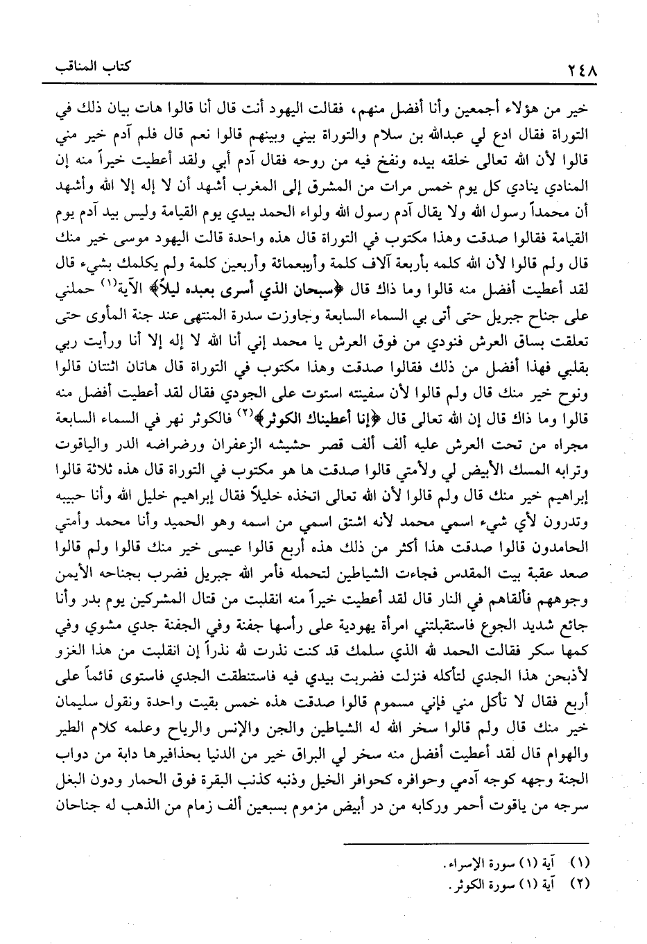 خَيْرٌ مِنْ هَؤُلاءِ أَجْمَعِينَ وَأَنَا أَفْضَلُ مِنْهُمْ، فَقَالَتِ الْيَهُودُ أَنْتَ قَالَ أَنَا قَالُوا هَاتِ بَيَانَ ذَلِكَ فِي التَّوْرَاةِ فَقَالَ ادْعُ لِي عَبْدَ اللَّهِ بْنَ سَلامٍ وَالتَّوْرَاةُ بَيْنِي وَبَيْنَهُمْ قَالُوا نَعَمْ قَالَ فَلِمَ آدَمُ خَيْرٌ مِنِّي قَالُوا لأَنَّ اللَّهَ تَعَالَى خَلَقَهُ بِيَدِهِ وَنَفَخَ فِيهِ مِنْ رُوحِهِ فَقَالَ آدَمُ أَبِي وَلَقَدْ أُعْطِيتُ خَيْرًا مِنْهُ إِنَّ الْمُنَادِي يُنَادِي كُلَّ يَوْمٍ خَمْسَ مَرَّاتٍ مِنَ الْمَشْرِقِ إِلَى الْمَغْرِبِ أَشْهَدُ أَن لَا إِلَه إِلَّا الله وأشهدُ أَنَّ مُحَمَّدًا رَسُولُ اللَّهِ وَلا يُقَالُ آدَمُ رَسُولُ اللَّهِ وَلِوَاءُ الْحَمْدِ بِيَدِي يَوْمَ الْقِيَامَةِ وَلَيْسَ بِيَدِ آدَمَ يَوْمَ الْقِيَامَةِ فَقَالُوا صَدَقْتَ وَهَذَا مَكْتُوبٌ فِي التَّوْرَاةِ قَالَ هَذِهِ وَاحِدَةٌ قَالَتِ الْيَهُودُ مُوسَى خَيْرٌ مِنْكَ قَالَ وَلِمَ قَالُوا لأَنَّ اللَّهَ كَلَّمَهُ بِأَرْبَعَةِ آلَاف كلمة وَأَرْبَعمِائَة وَأَرْبَعِينَ كَلِمَةً وَلَمْ يُكَلِّمْكَ بِشَيْءٍ قَالَ لَقَدْ أُعْطِيتُ أَفْضَلَ مِنْهُ قَالُوا وَمَا ذَلِك قَالَ {سُبْحَانَ الَّذِي أَسْرَى بِعَبْدِهِ لَيْلًا} الْآيَة حَمَلَنِي عَلَى جَنَاحِ جِبْرِيلَ حَتَّى أَتَى بِيَ السَّمَاءَ السَّابِعَةَ وَجَاوَزْتُ سِدْرَةَ الْمُنْتَهَى عِنْدَ جَنَّةِ الْمَأْوَى حَتَّى تَعَلَّقْتُ بِسَاقِ الْعَرْشِ فَنُودِيَ مِنْ فَوْقِ الْعَرْشِ يَا مُحَمَّدُ إِنِّي أَنَا اللَّهُ لَا إِلَهَ إِلا أَنَا وَرَأَيْتُ رَبِّي بِقَلْبِي فَهَذَا أَفْضَلُ مِنْ ذَلِكَ فَقَالُوا صَدَقْتَ وَهَذَا مَكْتُوبٌ فِي التَّوْرَاةِ قَالَ هَاتَانِ اثْنَتَانِ قَالُوا وَنُوحٌ خَيْرٌ مِنْكَ قَالَ وَلِمَ قَالُوا لأَنَّ سَفِينَتَهُ اسْتَوَتْ عَلَى الجودي فَقَالَ لَقَدْ أُعْطِيتُ أَفْضَلَ مِنْهُ قَالُوا وَمَا ذَاكَ قَالَ إِنَّ اللَّهَ تَعَالَى قَالَ {إِنَّا أَعْطَيْنَاكَ الْكَوْثَرَ} فَالْكَوْثَرُ نَهَرٌ فِي السَّمَاءِ السَّابِعَةِ مَجْرَاهُ مِنْ تَحْتِ الْعَرْشِ عَلَيْهِ أَلْفُ أَلْفِ قَصْرٍ حَشِيشُهُ الزَّعْفَرَانُ وَرَضْرَاضُهُ الدُّرُّ وَالْيَاقُوتُ وَتُرَابُهُ الْمِسْكُ الأَبْيَضُ لِي وَلأُمَّتِي قَالُوا صَدَقْتَ هَا هُوَ مَكْتُوبٌ فِي التَّوْرَاةِ قَالَ هَذِهِ ثَلاثَةٌ قَالُوا إِبْرَاهِيمُ خَيْرٌ مِنْكَ قَالَ وَلِمَ قَالُوا لأَنَّ اللَّهَ تَعَالَى اتَّخَذَهُ خَلِيلًا فَقَالَ إِبْرَاهِيمُ خَلِيلُ اللَّهِ وَأَنَا حَبِيبُهُ وَتَدْرُونَ لأَيِّ شَيْءٍ اسْمِي مُحَمَّدٌ لأَنَّهُ اشْتَقَّ اسْمِي مِنِ اسْمِهِ وَهُوَ الْحَمِيدُ وَأَنَا مُحَمَّدٌ وَأُمَّتِي الْحَامِدُونَ قَالُوا صَدَقْتَ هَذَا أَكْثَرُ مِنْ ذَلِكَ هَذِهِ أَرْبَعٌ قَالُوا عِيسَى خير مِنْك قَالُوا وَلِمَ قَالُوا صَعِدَ عَقَبَةَ بَيْتِ الْمَقْدِسِ فَجَاءَتُْ الشَّيَاطِينُ لِتَحْمِلَهُ فَأَمَرَ اللَّهُ جِبْرِيلَ فَضَرَبَ بِجَنَاحِهِ الأَيْمَنِ وُجُوهَهُمْ فَأَلْقَاهُمْ فِي النَّارِ قَالَ لَقَدْ أُعْطِيتُ خَيْرًا مِنْهُ انْقَلَبْتُ مِنْ قِتَالِ الْمُشْرِكِينَ يَوْمَ بَدْرٍ وَأَنَا جَائِعٌ شَدِيدُ الْجُوعِ فَاسْتَقْبَلَتْنِي امْرَأَةٌ يَهُودِيَّةٌ عَلَى رَأْسِهَا جَفْنَةٌ وَفِي الْجَفْنَةِ جَدْيٌ مَشْوِيٌّ وَفِي كُمِّهَا سُكَّرٌ فَقَالَتِ الْحَمْدُ لِلَّهِ الَّذِي سَلَّمَكَ قَدْ كُنْتُ نَذَرْتُ لِلَّهِ نَذْرًا إِنِ انْقَلَبْتَ مِنْ هَذَا الْغَزْوِ لأَذْبَحَنَّ هَذَا الْجَدْيَ لِتَأْكُلَهُ فَنَزَلْتُ فَضَرَبْتُ بِيَدِي فِيهِ فَاسْتَنْطَقْتُ الْجَدْيَ فَاسْتَوَى قَائِمًا عَلَى أَرْبَعٍ فَقَالَ لَا تَأْكُلْ مِنِّي فَإِنِّي مَسْمُومٌ قَالُوا صَدَقْتَ هَذِهِ خَمْسٌ بَقِيَتْ وَاحِدَةٌ وَنَقُولُ سُلَيْ