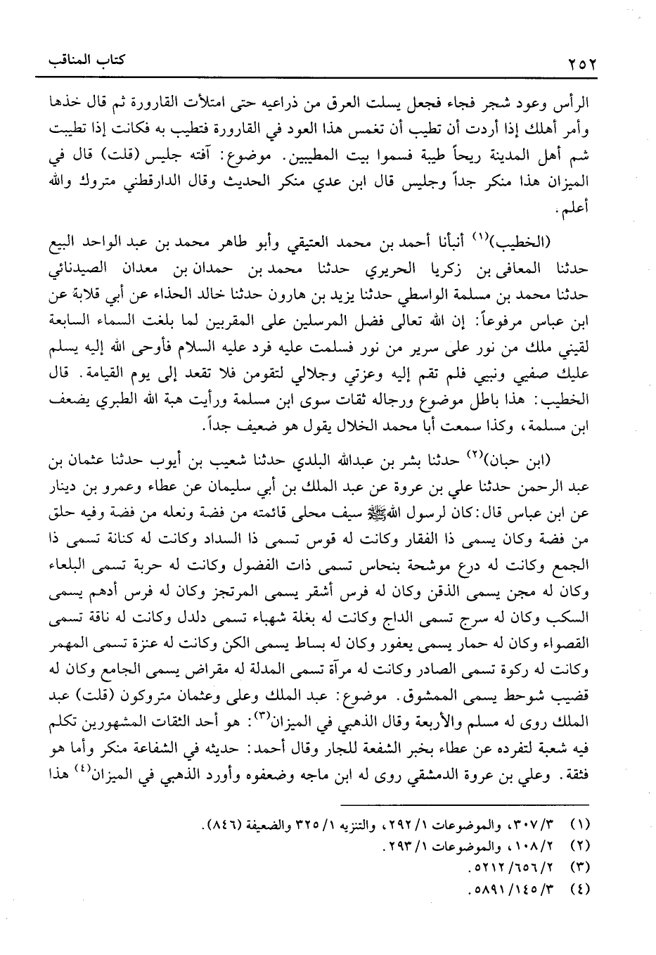 (ابْن حبَان) حَدَّثَنَا بشر بْن عَبْد الله الْبَلَدِي حَدَّثَنَا شُعَيْب بْن أَيُّوب حَدَّثَنَا عُثْمَان بْن عبد الرَّحْمَن حَدَّثَنَا عَلِيّ بْن عُرْوَة عَن عَبْد الْملك بْن أبي سُلَيْمَان عَن عَطاء وَعَمْرو بْن دِينَار عَن ابْن عَبَّاس قَالَ: كَانَ لرَسُول الله سَيْفٌ مُحَلًّى قَائِمَتُهُ مِنْ فِضَّةٍ وَنَعْلُهُ مِنْ فِضَّةٍ وَفِيهِ حَلَقٌ مِنْ فِضَّةٍ وَكَانَ يُسَمَّى ذَا الْفَقَارِ وَكَانَتْ لَهُ قَوْسٌ تُسَمَّى ذَا السَّدَادِ وَكَانَتْ لَهُ كِنَانةٌ تُسَمَّى ذَا الْجَمْعِ وَكَانَتْ لَهُ دِرْعٌ مُوَشَّحَةٌ بِنُحَاسٍ تُسَمَّى ذَاتَ الْفُضُولِ وَكَانَتْ لَهُ حَرْبَةٌ تُسَمَّى الْبَلْعَاءَ وَكَانَ لَهُ مِجَنٌّ يُسَمَّى الذَّقَنَ وَكَانَ لَهُ فَرَسٌ أَشْقَرُ يُسَمَّى الْمُرْتَجِزَ وَكَانَ لَهُ فَرَسٌ أَدْهَمُ يُسَمَّى السَّكْبَ وَكَانَ لَهُ سَرْجٌ تُسَمَّى الدَّاجَّ وَكَانَتْ لَهُ بغلة شهباء تسمى دُلْدُل وَكَانَتْ لَهُ نَاقَةٌ تُسَمَّى الْقَصْوَاءَ وَكَانَ لَهُ حِمَارٌ يُسَمَّى يَعْفُور وَكَانَ لَهُ بِسَاطٌ يُسَمَّى الْكِنَّ وَكَانَت لَهُ عنزة تسمى المهمر وَكَانَتْ لَهُ رَكْوَةٌ تُسَمَّى الصَّادِرَ وَكَانَتْ لَهُ مِرْآةٌ تُسَمَّى الْمُدِلَّةَ لَهُ مِقْرَاضٌ يُسَمَّى الْجَامِعَ وَكَانَ لَهُ قَضِيبٌ شَوْحَطٌ يُسَمَّى الْمَمْشُوقَ.