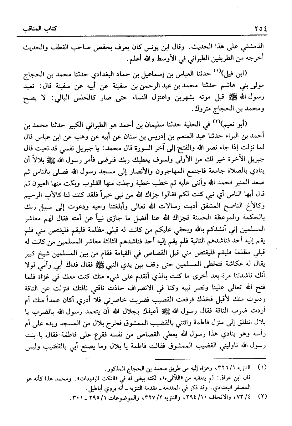 (أَبُو نُعَيْم) فِي الْحِلْية حَدَّثَنَا سُلَيْمَان بْن أَحْمَد هُو الطَّبَرَانِيّ الْكَبِير حَدَّثَنَا مُحَمَّد بْن أَحْمَد بْن الْبَراء حَدَّثَنَا عَبْد الْمُنعم بْن إِدْرِيس بْن سِنَان عَن أَبِيهِ عَن وهب عَنِ ابْنِ عَبَّاسٍ قَالَ لَمَّا نَزَلَتْ {إِذَا جَاءَ نصر الله وَالْفَتْح} إِلَى آخِرِ السُّورَةِ قَالَ مُحَمَّدٌ: يَا جِبْرِيلُ نَفْسِي قَدْ نُعِيَتْ قَالَ جِبْرِيل {الْآخِرَة خَيْرٌ لَكَ مِنَ الأُولَى وَلَسَوْفَ يعطيك رَبك فترضى} فَأمر رَسُول الله بِلالًا أَنْ يُنَادِيَ بِالصَّلاةِ جَامِعَةً فَاجْتَمَعَ الْمُهَاجِرُونَ وَالأَنْصَارُ إِلَى مَسْجِدِ رَسُول الله فَصَلَّى بِالنَّاسِ ثُمَّ صَعِدَ الْمِنْبَرَ فَحَمِدَ اللَّهَ وَأَثْنَى عَلَيْهِ ثُمَّ خَطَبَ خُطْبَةً وَجِلَتْ مِنْهَا الْقُلُوبُ وَبَكَتْ مِنْهَا الْعُيُونُ ثُمَّ قَالَ أَيُّهَا النَّاسُ أَيُّ نَبِيٍّ كُنْتُ لَكُمْ فَقَالُوا جَزَاكَ اللَّهُ مِنْ نَبِيٍّ خَيْرًا فَلَقَدْ كُنْتَ لَنَا كالأَبِ الرَّحِيمِ وَكَالأَخِ النَّاصِحِ الْمُشْفِقِ أَدَّيْتَ رِسَالاتِ اللَّهِ تَعَالَى وَأَبْلَغْتَنَا وَحْيَهُ وَدَعَوْتَ إِلَى سَبِيلِ رَبِّكَ بِالْحِكْمَةِ وَالْمَوْعِظَةِ الْحَسَنَةِ فَجَزَاكَ اللَّهُ عَنَّا أَفْضَلَ مَا جَازَى نَبِيًّا عَنْ أُمَّتِهِ فَقَالَ لَهُمْ مَعَاشِرَ الْمُسْلِمِينَ إِنِّي أَنْشُدُكُمْ بِاللَّهِ وَبِحَقِّي عَلَيْكُمْ مَنْ كَانَتْ لَهُ قِبَلِي مَظْلَمَةٌ فَلْيَقُمْ فَلْيَقْتَصَّ مِنِّي فَلم يقم إِلَيْهِ أحد فناشدهم الثَّانِيَة فَلم يقم إِلَيْهِ أحد فناشدهم الثَّالِثَة معاشر الْمُسلمين من كَانَت لَهُ قِبَلِي مَظْلَمَةٌ فَلْيَقُمْ فَلْيَقْتَصَّ مني قبل الْقصاص فِي الْقِيَامَةِ فَقَامَ مِنْ بَيْنِ الْمُسْلِمِينَ شَيْخٌ كَبِيرٌ يُقَالُ لَهُ عُكَّاشَةُ فَتَخَطَّى الْمُسْلِمِينَ حَتَّى وَقَفَ بَيْنَ يَدي النَّبِي فَقَالَ فِدَاكَ أَبِي وَأُمِّي لَوْلا أَنَّكَ نَاشَدْتَنَا مَرَّةً بَعْدَ أُخْرَى مَا كُنْتُ بِالَّذِي أَتَقَدَّمُ عَلَى شَيْءٍ مِنْكَ كُنْتُ مَعَكَ فِي غَزَاةٍ فَلَمَّا فَتَحَ اللَّهُ تَعَالَى عَلَيْنَا وَنَصَرَ نَبِيَّهُ وَكُنَّا فِي الانْصِرَافِ حَاذَتْ نَاقَتِي نَاقَتَكَ فَنَزَلْتُ عَنِ النَّاقَةِ وَدَنَوْتُ مِنْكَ لأُقَبِّلَ فَخِذَكَ فَرَفَعْتَ الْقَضِيبَ فَضَرَبْتَ خَاصِرَتِي فَلا أَدْرِي أَكَانَ عَمْدًا مِنْكَ أَمْ أَرَدْتَ ضَرْبَ النَّاقَةِ فَقَالَ رَسُول الله أُعِيذُكَ بِجَلالِ اللَّهِ أَنْ يَتَعَمَّدَ رَسُولُ اللَّهِ بِالضَّرْبِ يَا بِلالُ انْطَلِقْ إِلَى مَنْزِلِ فَاطِمَةَ وَائْتِنِي بِالْقَضِيبِ الْمَمْشُوقِ فَخَرَجَ بِلالٌ مِنَ الْمَسْجِدِ وَيَدُهُ عَلَى أُمِّ رَأْسِهِ وَهُوَ يُنَادِي هَذَا رَسُولُ اللَّهِ يُعْطِي الْقِصَاصَ مِنْ نَفْسِهِ فَقَرَعَ عَلَى فَاطِمَةَ فَقَالَ يَا بِنْتَ رَسُولِ اللَّهِ نَاوِلِينِي الْقَضِيبَ الْمَمْشُوقَ فَقَالَتْ فَاطِمَةُ يَا بِلالُ وَمَا يصنع أبي بالقضيب وَلَيْسَ