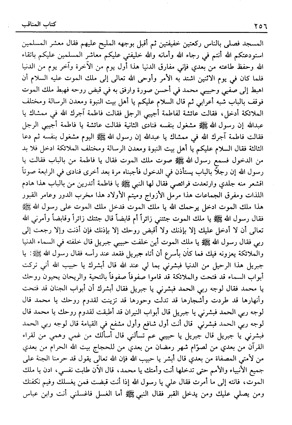 الْمَسْجِدِ فَصَلَّى بِالنَّاسِ رَكْعَتَيْنِ خَفِيفَتَيْنِ ثُمَّ أَقْبَلَ بِوَجْهِهِ الْمَلِيحِ عَلَيْهِمْ فَقَالَ معشر الْمُسلمين استودعتكم اللَّهَ أَنْتُمْ فِي رَجَاءِ اللَّهِ وَأَمَانَه وِاللَّهِ خَلِيفَتِي عَلَيْكُمْ مَعَاشِرَ الْمُسْلِمِينَ عَلَيْكُمْ بِاتِّقَاءِ اللَّهِ وَحِفْظِ طَاعَتِهِ مِنْ بَعْدِي فَإِنِّي مُفَارِقُ الدُّنْيَا هَذَا أَوَّلُ يَوْمٍ مِنَ الآخِرَةِ وَآخِرُ يَوْمٍ مِنَ الدُّنْيَا فَلَمَّا كَانَ فِي يَوْمِ الاِثْنَيْنِ اشْتَدَّ بِهِ الأَمْرُ وَأَوْحَى اللَّهُ تَعَالَى إِلَى مَلَكِ الْمَوْتِ عَلَيْهِ السَّلامُ أَنِ اهْبِطْ إِلَى صَفِيِّي وَحَبِيبِي مُحَمَّدٍ فِي أَحْسَنِ صُورَةٍ وَارْفُقْ بِهِ فِي قَبْضِ رُوحِهِ فَهَبَطَ مَلَكُ الْمَوْتِ فَوَقَفَ بِالْبَابِ شِبْهَ أَعْرَابِيٍّ ثُمَّ قَالَ السَّلامُ عَلَيْكُمْ يَا أَهْلَ بَيْتِ النُّبُوَّةِ وَمَعْدِنَ الرِّسَالَةِ وَمُخْتَلَفَ الْمَلائِكَةِ آدخُلُ، فَقَالَتْ عَائِشَةُ لِفَاطِمَةَ أَجِيبِي الرَّجُلَ فَقَالَتْ فَاطِمَةُ آجَرَكَ اللَّهُ فِي مَمْشَاكَ يَا عَبْدَ اللَّهِ إِنَّ رَسُول الله مَشْغُولٌ بِنَفْسِهِ فَنَادَى الثَّانِيَةَ فَقَالَتْ عَائِشَةُ يَا فَاطِمَةُ أَجِيبِي الرَّجُلَ فَقَالَتْ فَاطِمَةُ آجَرَكَ اللَّهُ فِي مَمْشَاكَ يَا عَبْدَ اللَّهِ إِنَّ رَسُول الله الْيَوْمَ مَشْغُولٌ بِنَفْسِهِ ثُمَّ دَعَا الثَّالِثَةَ فَقَالَ السَّلامُ عَلَيْكُمْ يَا أَهْلَ بَيْتِ النُّبُوَّةِ وَمَعْدِنَ الرِّسَالَةِ وَمُخْتَلَفَ الْمَلائِكَةِ آدخُلُ فَلا بُدَّ مِنَ الدُّخُولِ فَسَمِعَ رَسُولُ اللَّهِ صَوْتَ مَلَكِ الْمَوْتِ فَقَالَ يَا فَاطِمَة من بِالْبَابِ فَقَالَت يَا رَسُولَ اللَّهِ إِنَّ رَجُلًا بِالْبَابِ يَسْتَأْذِنُ فِي الدُّخُولِ فَأَجَبْنَاهُ مَرَّةً بَعْدَ أُخْرَى فَنَادَى فِي الرَّابِعَةِ صَوْتًا اقْشَعَرَّ مِنْهُ جِلْدِي وَارْتَعَدَتْ فَرَائِصِي فَقَالَ لَهَا النَّبِيُّ يَا فَاطِمَةُ أَتَدْرِينَ مَنْ بِالْبَابِ هَذَا هَادِمُ اللَّذَّاتِ وَمُفَرِّقُ الْجَمَاعَاتِ هَذَا مُرَمِّلُ الأَزْوَاجِ وَمُيَتِّمُ الأَوْلادِ هَذَا مُخَرِّبُ الدُّورِ وَعَامِرُ الْقُبُورِ هَذَا مَلَكُ الْمَوْتِ ادْخُلْ يَرْحَمُكَ اللَّهُ يَا مَلَكَ الْمَوْتِ فَدخل ملك الْمَوْت على رَسُول الله فَقَالَ رَسُول الله يَا ملك الْمَوْت جِئْتَنِي زَائِرًا أَمْ قَابِضًا قَالَ جِئْتُكَ زَائِرًا وَقَابِضًا وَأَمَرَنِي اللَّهُ تَعَالَى أَنْ لَا أَدْخُلَ عَلَيْكَ إِلا بِإِذْنِكَ وَلا أَقْبِضَ رُوحَكَ إِلا بِإِذْنِكَ فَإِنْ أَذِنْتَ وَإِلا رَجَعْتُ إِلَى رَبِّي فَقَالَ رَسُول الله يَا مَلَكَ الْمَوْتِ أَيْنَ خَلَّفْتَ حَبِيبِي جِبْرِيلَ قَالَ خَلَّفْتُهُ فِي السَّمَاءِ الدُّنْيَا وَالْمَلائِكَةُ يُعَزُّونَهُ فِيكَ فَمَا كَانَ بِأَسْرَعِ أَنْ أَتَاهُ جِبْرِيلُ فَقَعَدَ عِنْدَ رَأْسِهِ فَقَالَ رَسُول الله: يَا جِبْرِيلُ هَذَا الرَّحِيلُ مِنَ الدُّنْيَا فَبَشِّرْنِي بِمَا لِي عِنْدَ اللَّهِ قَالَ أُبَشِّرُكَ يَا حَبِيبَ اللَّهِ أَنِّي تَرَكْتُ أَبْوَابَ السَّمَاءِ قَدْ فُتِحَتْ وَالْمَلائِكَةُ قَدْ قَامُوا صُفُوفًا صُفُوفًا بِالتَّحِيَّةِ وَالرَّيْحَانِ يُحَيُّونَ رُوحَكَ يَا مُحَمَّدُ فَقَالَ لِوَجْهِ رَبِّي الْحَمْدُ فَبَشِّرْنِي يَا جِبْرِيلُ فَقَالَ أُبَشِّرُكَ أَنَّ أَبْوَابَ الْجِنَانِ قَدْ فُتِحَتْ وَأَنْهَارُهَا قَدِ طَّرَدَتْ وَأَشْجَارُهَا قَدْ تَدَلَّتْ وَحُورُهَا قَدْ تَزَيَّنَتْ لِقُدُومِ رُوحِكَ يَا مُحَمَّدُ قَالَ لِوَجْهِ رَبِّي الْحَمْدُ فَبَشِّرْنِي يَا جِبْرِيلُ قَالَ أَبْوَابُ النِّيرَانِ قَدْ أُطْبِقَتْ لِقُدُومِ رُوحِكَ يَا مُحَمَّدُ قَالَ لِوَجْهِ رَبِّي الْحَمْدُ فبشرني قَالَ أَنْتَ أَوَ