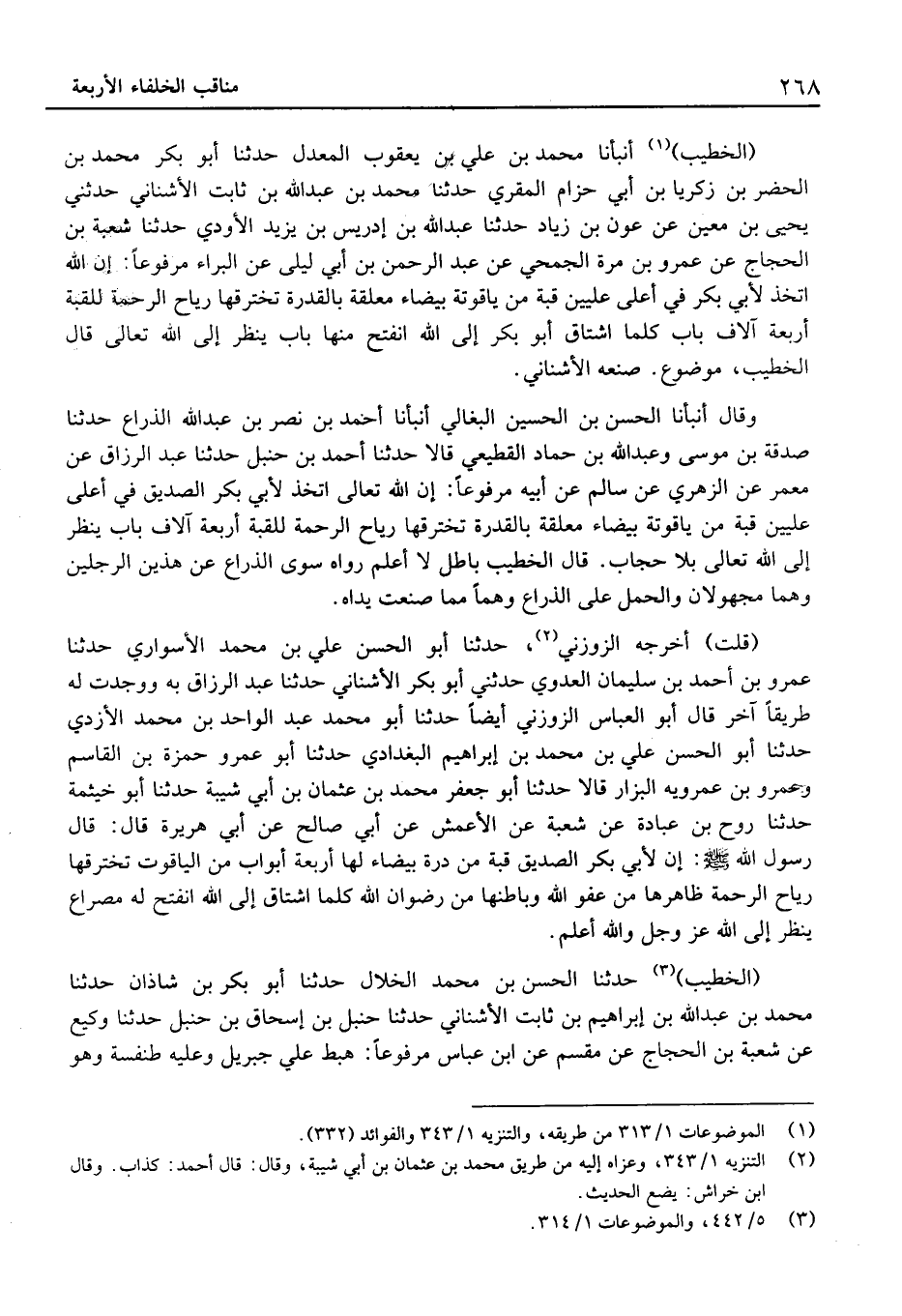 (الْخَطِيب) أَنْبَأنَا مُحَمَّد بْن عَلِيّ بْن يَعْقُوب الْمعدل حَدَّثَنَا أَبُو بَكْر مُحَمَّد بْن الْحَضَر بْن زَكَرِيَّا بن أبي حزَام الْمقري حَدَّثَنَا مُحَمَّد بْن عَبْد الله بْن ثَابت الْأُشْنَانِي حدَّثَنِي يَحْيَى بْن معِين عَن عون بْن زِيَاد حَدَّثَنَا عَبْد الله بْن إِدْرِيس بْن يزِيد الأودي حَدَّثَنَا شُعْبَة بْن الْحجَّاج عَن عَمْرو بْن مرّة الجُمَحِي عَن عَبْد الرَّحْمَن بْن أبي ليلى عَنِ الْبَرَاءِ مَرْفُوعا: إِنَّ اللَّهَ اتَّخَذَ لأَبِي بَكْرٍ فِي أَعْلَى عِلِّيِّينَ قُبَّةً مِنْ يَاقُوتَةٍ بَيْضَاءَ مُعَلَّقَةٍ بِالْقُدْرَةِ تَخْتَرِقُهَا رِيَاحُ الرَّحْمَةِ لِلْقُبَّةِ أَرْبَعَةُ آلافِ بَابٍ كُلَّمَا اشْتَاقَ أَبُو بَكْرٍ إِلَى اللَّهِ انْفَتَحَ مِنْهَا بَابٌ يَنْظُرُ إِلَى اللَّهِ تَعَالَى قَالَ الْخَطِيب، مَوْضُوع.