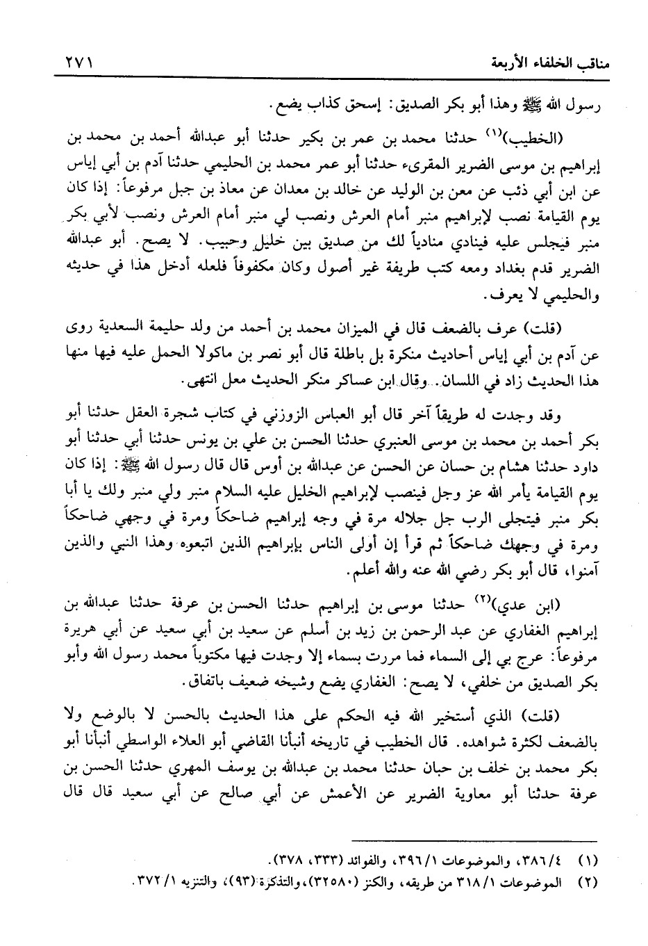 (الْخَطِيب) حَدَّثَنَا مُحَمَّد بْن عُمَر بْن بكير حَدَّثَنَا أَبُو عَبْد الله أَحْمَد بْن مُحَمَّد بْن إِبْرَاهِيم بْن مُوسَى الضَّرِير الْمُقْرِئ حَدَّثَنَا أَبُو عُمَر مُحَمَّد بْن الْحَلِيمِيّ حَدَّثَنَا آدم بْن أبي إِيَاس عَن ابْن أبي ذِئْب عَن معن بْن الْوَلِيد عَن خَالِد بْن معدان عَن مُعَاذِ بْنِ جَبَلٍ مَرْفُوعًا: إِذَا كَانَ يَوْمُ الْقِيَامَةِ نُصِبَ لإِبْرَاهِيمَ مِنْبَرٌ أَمَامَ الْعَرْشِ وَنُصِبَ لِي مِنْبَرٌ أَمَامَ الْعَرْشِ وَنُصِبَ لأَبِي بَكْرٍ مِنْبَرٌ فَيَجْلِسُ عَلَيْهِ فَيُنَادِي منادياً لَكَ مِنْ صِدِّيقٍ بَيْنَ خَلِيلٍ وَحَبِيبٍ.