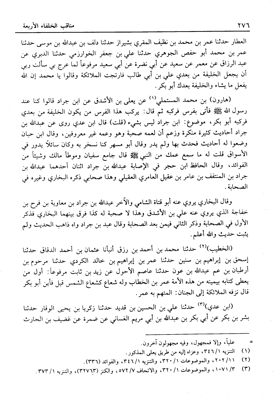 (هَارُون) بْن مُحَمَّد الْمُسْتَمْلِي عَن يَعْلَى بْن الْأَشْدَق عَن ابْن جَراد قَالوا كُنَّا عِنْدَ رَسُول الله فَأتي بفرس فَرَكبهُ ثُمَّ قَالَ: يركبُ هَذَا الْفرس من يكون الْخَلِيفَة من بعدِي فَرَكبهُ أَبُو بَكْر، مَوْضُوع: ابْن جَراد لَيْسَ بِشَيْء (قلت) قَالَ ابْن عدي روى عَن عَبْد الله بْن جَراد أَحَادِيث كَثِيرَة مُنكرَة وَزعم أَن لِعَمِّهِ صُحْبَة وَهُوَ وَعَمه غير معروفين، وَقَالَ ابْن حبَان وضعُوا لَهُ أَحَادِيث فَحدث بِهَا ولَمْ يدر وَقَالَ أَبُو مسْهر كُنَّا نسخر بِهِ وَكَانَ سَائِلًا يَدُور فِي الْأَسْوَاق قلتُ لَهُ مَا سمعَ عمك من النَّبِيّ قَالَ جَامع سُفْيَان وموطأ مَالك وشيئًا من الْفَوَائِد، وَقَالَ الْحَافِظ ابْن حجر فِي الْإِصَابَة عَبْد الله بْن جَراد اثْنَان أَحدهمَا عَبْد الله بْن جَراد بْن المنتفف بْن عَامر بْن عقيل العامري الْعقيلِيّ وَهَذَا صَحَابِيّ ذكره الْبُخَاريّ وَغَيره فِي الصَّحَابَة.