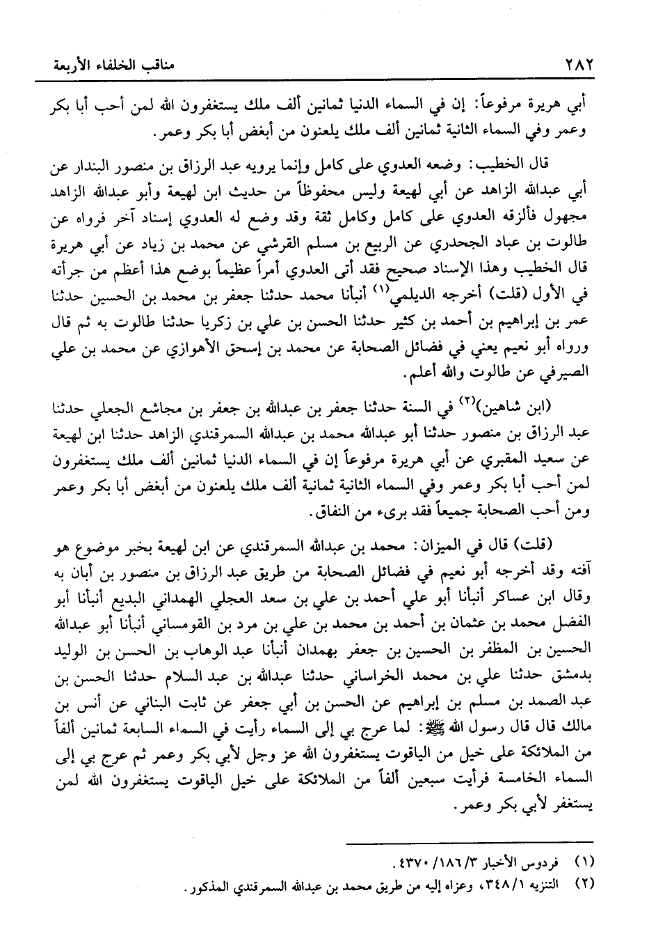 (ابْن شاهين) فِي السّنة حَدَّثَنَا جَعْفَر بْن عَبْد الله بْن جَعْفَر بْن مجاشع الجعلي حَدَّثَنَا عَبْد الرَّزَّاق بْن مَنْصُور حَدَّثَنَا أَبُو عَبْد الله مُحَمَّد بْن عَبْد الله السَّمرقَنْدِي الزَّاهِد حَدَّثَنَا ابْن لَهِيعَة عَن سَعِيد المَقْبُري عَنْ أَبِي هُرَيْرَةَ مَرْفُوعا إِنَّ فِي السَّمَاءِ الدُّنْيَا ثَمَانِينَ أَلْفَ مَلَكٍ يَسْتَغْفِرُونَ لِمَنْ أَحَبَّ أَبَا بَكْرٍ وَعُمَرَ وَفِي السَّمَاءِ الثَّانِيَةِ ثَمَانِيَةَ أَلْفَ مَلَكٍ يَلْعَنُونَ مَنْ أَبْغَضَ أَبَا بَكْرٍ وَعُمَرَ وَمَنْ أَحَبَّ الصَّحَابَةَ جَمِيعًا فَقَدْ بَرِئَ مِنَ النِّفَاقِ.