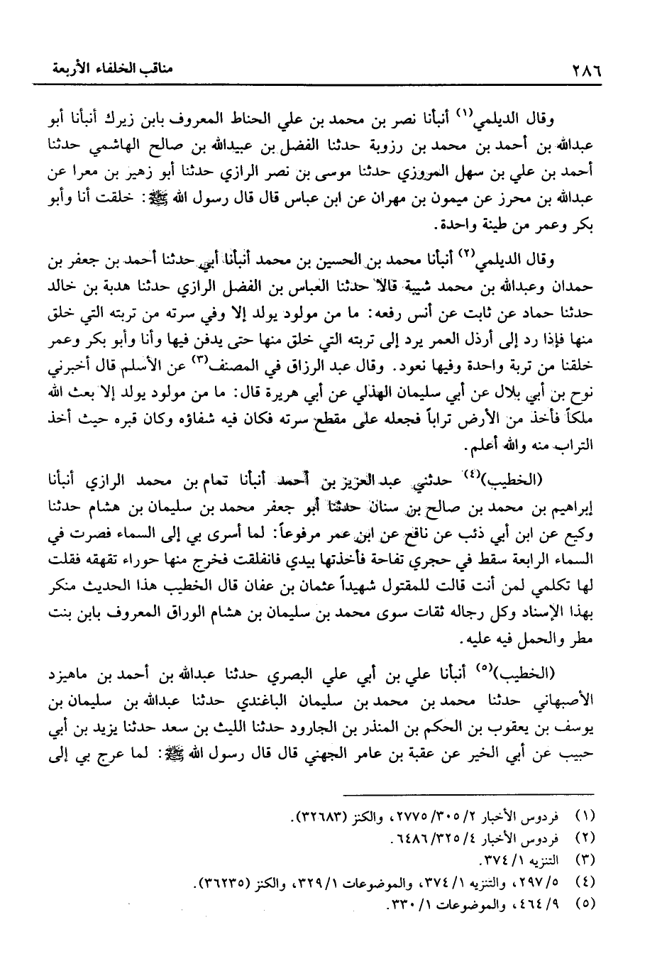 وَقَالَ الديلمي أَنْبَأنَا نصر بْن مُحَمَّد بْن عَليّ الحناط الْمَعْرُوف بِابْن زيرك أَنْبَأنَا أَبُو عَبْد الله بْن أَحْمَد بْن مُحَمَّد بْن رزوبة حَدَّثَنَا الْفضل بْن عُبَيْد الله بْن صالِح الْهَاشِمِي حَدَّثَنَا أَحْمَد بْن عَلِيّ بْن سهل الْمَرْوَزِيّ حَدَّثَنَا مُوسَى بْن نصر الرَّازِيّ حَدَّثَنَا أَبُو زُهَيْر بْن معرا عَن عَبْد الله بْن مُحرز عَن مَيْمُون بْن مهْرَان عَنِ ابْنِ عَبَّاسٍ قَالَ قَالَ رَسُول الله: خلقتُ أَنَا وَأَبُو بَكْر وَعمر من طِينَة وَاحِدَة.