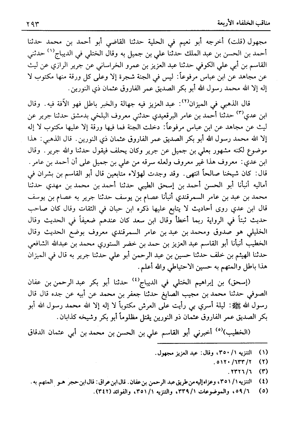 (إِسْحَاق) بْن إِبْرَاهِيم الْخُتلِي فِي الديباج حَدَّثَنَا أَبُو بَكْر عَبْد الرَّحْمَن بْن عَفَّان الصُّوفِي حَدَّثَنَا مُحَمَّد بْن مُجيب الصايغ حَدَّثَنَا جَعْفَرُ بْنُ مُحَمَّدٍ عَن أَبِيهِ عَن جَدِّهِ قَالَ قَالَ رَسُول الله: لَيْلَةَ أُسْرِيَ بِي رَأَيْتُ عَلَى الْعَرْشِ مَكْتُوبًا لَا إِلَهَ إِلا الله مُحَمَّد رَسُول الله أَبُو بكر الصّديق عمر الْفَارُوق وَعُثْمَان ذُو النُّورَيْنِ يُقْتَلُ مَظْلُومًا أَبُو بَكْرٍ وَشَيْخُهُ كَذَّابَانِ.