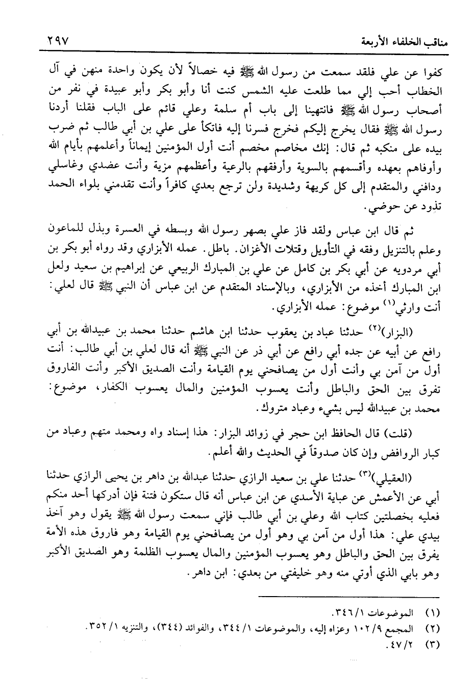 (الْعقيلِيّ) حَدَّثَنَا عَلِيّ بْن سَعِيد الرَّازِيّ حَدَّثَنَا عَبْد الله بْن داهر بْن يَحْيَى الرَّازِيّ حَدَّثَنَا أبي عَن الْأَعْمَش عَن عَبَايَة الْأَسدي عَنِ ابْنِ عَبَّاسٍ أَنَهُ قَالَ سَتَكُونُ فِتْنَةٌ فَإِنْ أَدْرَكَهَا أَحَدٌ مِنْكُمْ فَعَلَيْهِ بِخَصْلَتَيْنِ كتاب اللَّهِ وَعَلِيِّ بْنِ أَبِي طَالِبٍ فَإِنِّي سَمِعت رَسُول الله يَقُولُ وَهُوَ آخِذٌ بِيَدِي عَلَى: هَذَا أَوَّلُ مَنْ آمَنَ بِي وَهُوَ أَوَّلُ مَنْ يُصَافِحُنِي يَوْمَ الْقِيَامَةِ وَهُوَ فَارُوقُ هَذِهِ الأُمَّةِ يُفَرِّقُ بَيْنَ الْحَقِّ وَالْبَاطِلِ وَهُوَ يَعْسُوبُ الْمُؤْمِنِينَ وَالْمَالُ يَعْسُوبُ الظَّلَمَةِ وَهُوَ الصِّدِّيقُ الأَكْبَرُ وَهُوَ بَابِي الَّذِي أُوتِيَ مِنْهُ وَهُوَ خَلِيفَتِي من بعدِي: ابْن داهر.