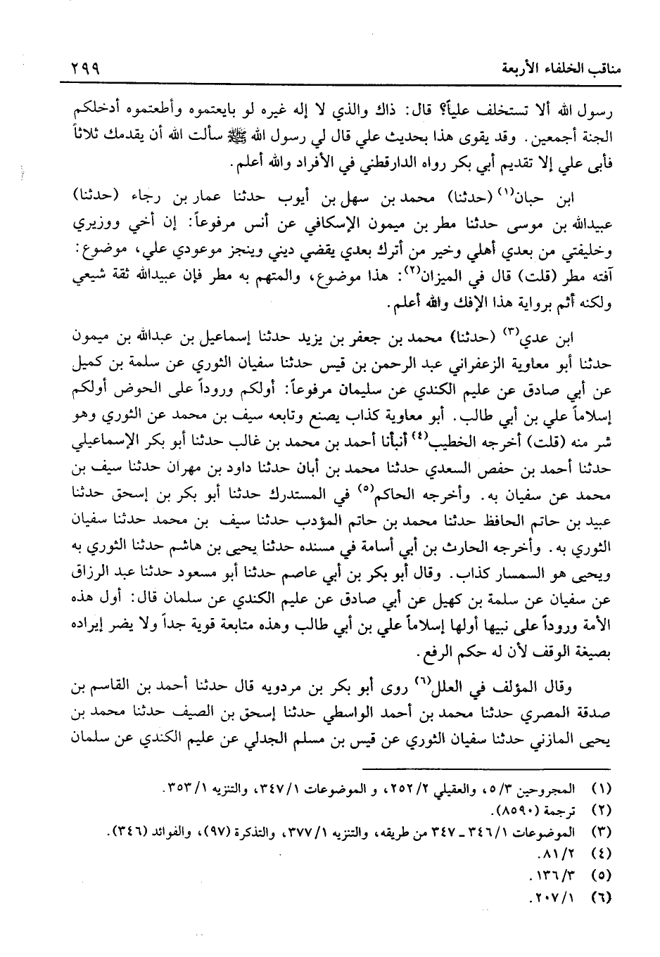 ابْن حبَان (حَدَّثَنَا) مُحَمَّد بْن سهل بْن أَيُّوب حَدَّثَنَا عمّار بْن رَجَاء (حَدَّثَنَا) عُبَيْد الله بْن مُوسَى حَدَّثَنَا مطر بْن مَيْمُون الإسكافي عَنْ أَنَسٍ مَرْفُوعا: إِنَّ أَخِي وَوَزِيرِي وخليفتي من بعدِي أَهلِي خير مَنْ أَتْرُكُ بَعْدِي يَقْضِي دِينِي وينجز موعودي عَلِيٌّ، مَوْضُوع: آفته مطر (قلت) قَالَ فِي الْمِيزَان: هَذَا مَوْضُوع، وَالْمُتَّهَم بِهِ مطر فَإِن عُبَيْد الله ثِقَة شيعي وَلكنه أَثم بِرِوَايَة هَذَا الْإِفْك وَالله أعلم.