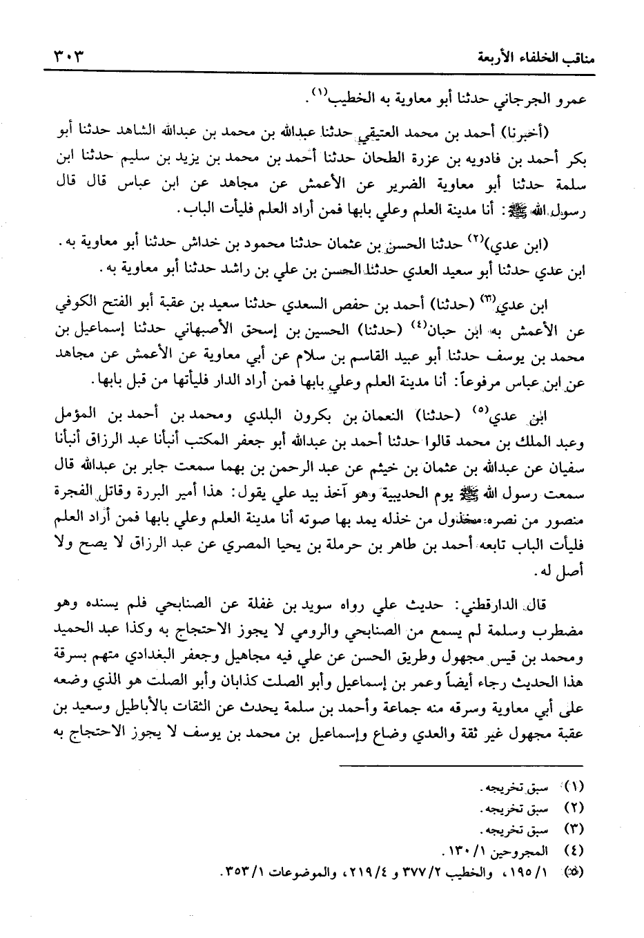 ابْن عدي (حَدَّثَنَا) النُّعْمَان بْن بكرون الْبَلَدِي وَمُحَمَّد بْن أَحْمَد بْن المؤمل وَعبد الْملك بْن مُحَمَّد قَالُوا حَدَّثَنَا أَحْمَد بْن عَبْد الله أَبُو جَعْفَر الْمكتب أَنْبَأنَا عَبْد الرَّزَّاق أَنْبَأنَا سُفْيَان عَن عَبْد الله بْن عُثْمَان بْن خَيْثَم عَن عَبْد الرَّحْمَن بْن بهما سَمِعْتُ جَابِر بْن عَبْد الله قَالَ سَمِعت رَسُولُ اللَّهِ يَوْمَ الْحُدَيْبِيَةِ وَهُوَ آخِذٌ بِيَدِ عَلِيٍّ يَقُولُ: هَذَا أَمِيرُ الْبَرَرَةِ وَقَاتِلُ الْفَجَرَةِ مَنْصُورٌ مَنْ نَصَرَهُ مَخْذُولٌ مَنْ خَذَلَهُ يَمُدُّ بِهَا صَوْتَهُ أَنَا مَدِينَةُ الْعِلْمِ وَعَلِيٌّ بَابُهَا فَمَنْ أَرَادَ الْعِلْمَ فَلْيَأْتِ الْبَابَ تَابعه أَحْمَد بْن طَاهِر بْن حَرْمَلَة بْن يحيا الْمَصْرِيّ عَن عَبْد الرَّزَّاق لَا يَصِحُّ وَلَا أصل لَهُ.