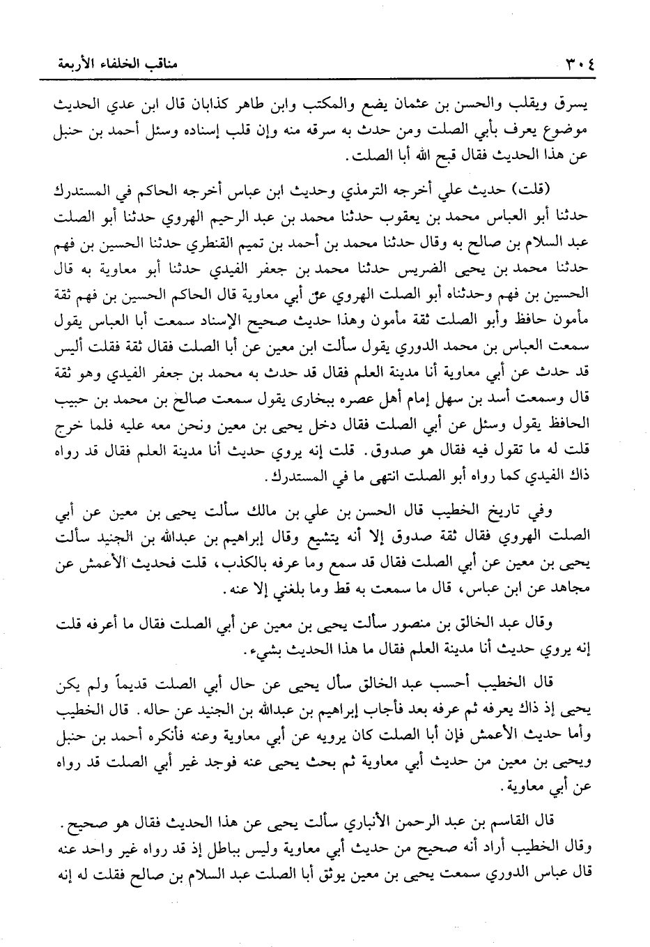 وَقَالَ الْخَطِيب أَرَادَ أَنَّهُ صَحِيح من حَدِيث أبي مُعَاويَة وَلَيْسَ بباطل إِذْ قد رَوَاهُ غير وَاحِد عَنْهُ قَالَ عَبَّاس الدوري سمعتُ يَحْيَى بْن معِين يوثق أَبَا الصَّلْت عَبْد السَّلَام بْن صَالح فقلتُ لَهُ إِنَّه