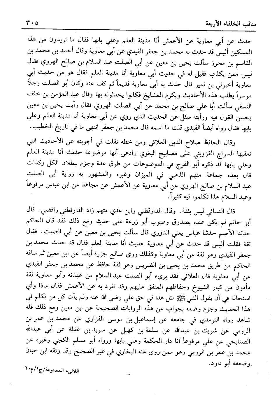 فَقَالَ ثِقَة فقلتُ أَلَيْسَ قد حَدَّث عَن أبي مُعَاويَة حَدِيث أَنَا مَدِينَة الْعلم فَقَالَ قد حدث مُحَمَّد بن جَعْفَر الفيدي وَهُوَ ثِقَة عَن أبي مُعَاوِيَة وَكَذَلِكَ روى صالِح جزرة أَيْضا عَن ابْن معِين ثُمَّ سَاقه الْحَاكِم من طَرِيق مُحَمَّد بْن يَحْيَى بْن الضريس وَهُوَ ثِقَة حَافظ عَن مُحَمَّد بْن جَعْفَر الفيدي عَن أبي مُعَاويَة قَالَ العلائي فقد برِئ أَبُو الصَّلْت عَبْد السَّلَام من عهدته وَأَبُو مُعَاويَة ثِقَة مَأْمُون من كبار الشُّيُوخ وحفاظهم الْمُتَّفق عَلَيْهِم وَقد تفرد بِهِ عَن الْأَعْمَش فَقَالَ مَاذَا وَأي اسْتِحَالَة فِي أَن يَقُول النَّبِي مثل هَذَا فِي حق عَليّ رَضِيَ اللهُ عَنْهُ ولَمْ يَأْتِ كل من تكلم فِي هَذَا الحَدِيث وَجزم وَضعه بِجواب عَن هَذِه الرِّوَايَات الصَّحِيحَة عَن ابْن معِين وَمَعَ ذَلِكَ فَلهُ شَاهد رواهُ التِّرْمِذِيّ فِي جَامعه عَن إِسْمَاعِيل بْن مُوسَى الْفَزارِيّ عَن مُحَمَّد بْن عُمَر بْن الرُّومِي عَن شريك بْن عَبْد الله عَن سَلمَة بْن كهيل عَن سُوَيْد بْن غَفلَة عَن أبي عَبْد الله الصنَابحِي عَن عَليّ مَرْفُوعا أَنَا دَار الْحِكْمَة وَعلي بَابهَا ورواهُ أَبُو مُسْلِم الْكَجِّي وَغَيره عَن مُحَمَّد بْن عُمَر بْن الرُّومِي وَهُوَ مِمَّن روى عَنْهُ الْبُخَاريّ فِي غير الصَّحِيح وَقد وَثَّقَهُ ابْن حبَان وَضَعفه أَبُو دَاوُد.