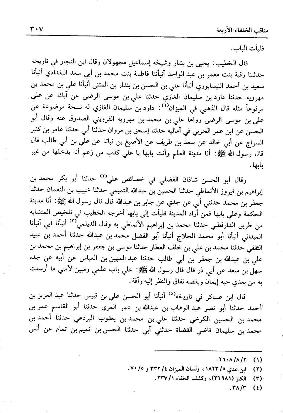 وَقَالَ أَبُو الْحَسَن شَاذان الفضلي فِي خَصَائِص عَليّ حَدَّثَنَا أَبُو بَكْر مُحَمَّد بْن إِبْرَاهِيم بْن فَيْرُوز الأنْمَاطي حَدَّثَنَا الْحُسَيْن بْن عَبْد الله التَّمِيمِي حَدَّثَنَا خبيب بْن النُّعْمَان حَدَّثَنَا جَعْفَر بْن مُحَمَّد حدَّثَنِي أبي عَن جدِّي عَن جَابِر بْن عَبْد الله قَالَ قَالَ رَسُول الله: أَنَا مَدِينَةُ الْحِكْمَةِ وَعَلِيٌّ بَابُهَا فَمَنْ أَرَادَ الْمَدِينَةَ فَلْيَأْتِ إِلَى بَابِهَا أَخْرَجَهُ الْخَطِيب فِي تَلْخِيص الْمُتَشَابه من طَرِيق الدَّارَقُطْنِيّ حَدَّثَنَا مُحَمَّد بْن إِبْرَاهِيم الأنْمَاطي بِهِ وَقَالَ الديلمي أَنْبَأنَا أَبِي أَنْبَأنَا الميداني أنبانا أَبُو مُحَمَّد الحلاج أَنْبَأنَا أَبُو الْفضل مُحَمَّد بْن عَبْد الله حَدَّثَنَا أَحْمَد بْن عُبَيْد الثَّقَفِيّ حَدَّثَنَا مُحَمَّد بْن عَلِيّ بْن خلف الْعَطَّار حَدَّثَنَا مُوسَى بْن جَعْفَر بْن إِبْرَاهِيم بْن مُحَمَّد بْن عَلِيّ بْن عَبْد الله بْن جَعْفَر بْن أبي طَالب حَدَّثَنَا عَبْد المهين بْن الْعَبَّاس عَن أَبِيهِ عَن جدِّه سهل بْن سعد عَنْ أَبِي ذَرٍّ قَالَ قَالَ رَسُولُ الله: عَلِيٌّ بَابُ عِلْمِي وَمُبَيِّنٌ لأُمَّتِي مَا أُرْسِلْتُ بِهِ مِنْ بَعْدِي حُبُّهُ إِيمَانٌ وَبُغْضُهُ نِفَاقٌ وَالنَّظَرُ إِلَيْهِ رَأْفَةٌ.