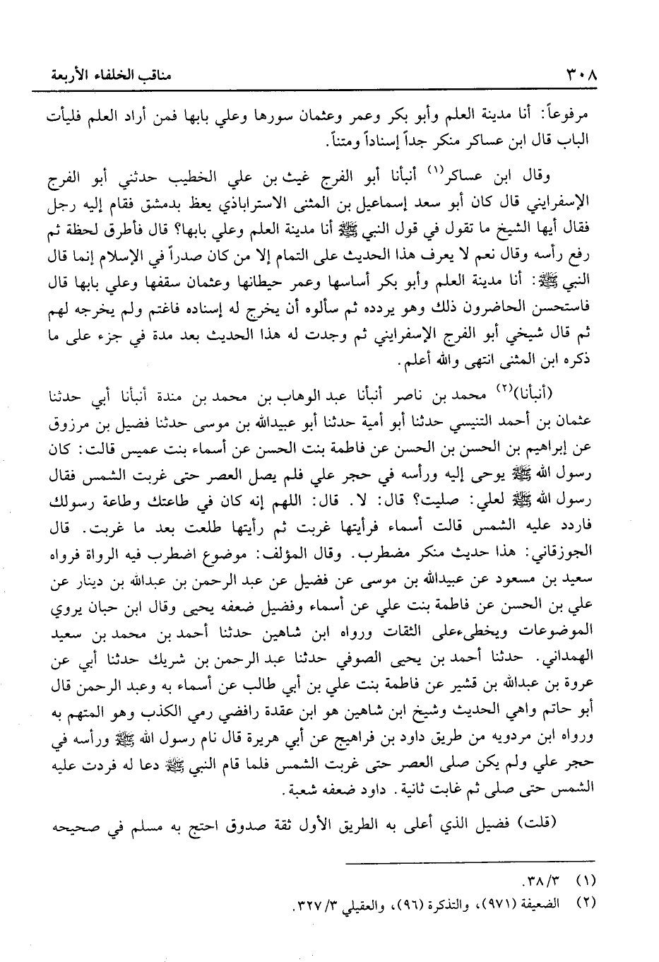 وَقَالَ ابْن عَسَاكِر أَنْبَأنَا أَبُو الْفرج غيث بْن عَليّ الْخَطِيب حدَّثَنِي أَبُو الْفرج الإسفرايني قَالَ كَانَ أَبُو سعد إِسْمَاعِيل بْن الْمثنى الأستراباذي يعظ بِدِمَشْق فَقَامَ إِلَيْهِ رَجُل فَقَالَ أيُّها الشَّيْخ مَا تقولُ فِي قَول النَّبِي أَنَا مَدِينَةُ الْعِلْمِ وَعَلِيٌّ بَابُهَا؟ قَالَ فَأَطْرَقَ لَحْظَة ثُمَّ رفع رَأسه وَقَالَ نعم لَا يعرف هَذَا الحَدِيث عَلَى التَّمام إِلَّا من كَانَ صَدرا فِي الْإسْلَام إِنَّمَا قَالَ النَّبِي: أَنَا مَدِينَةُ الْعِلْمِ وَأَبُو بَكْرٍ أساسها وَعمر حيطانها وَعُثْمَان سقفها وَعلي بَابهَا قَالَ فاستحسنَ الحاضرونَ ذَلِكَ وَهُوَ يردده ثُمَّ سألوهُ أَن يخرج لَهُ إِسْنَاده فَاغْتَمَّ وَلَمْ يُخرجهُ لَهُم ثُمَّ قَالَ شَيْخي أَبُو الْفرج الإسفرايني ثُمَّ وجدتُ لَهُ هَذَا الحَدِيث بعد مُدَّة فِي جُزْء عَلَى مَا ذكره ابْن الْمثنى انْتهى وَالله أعلم.