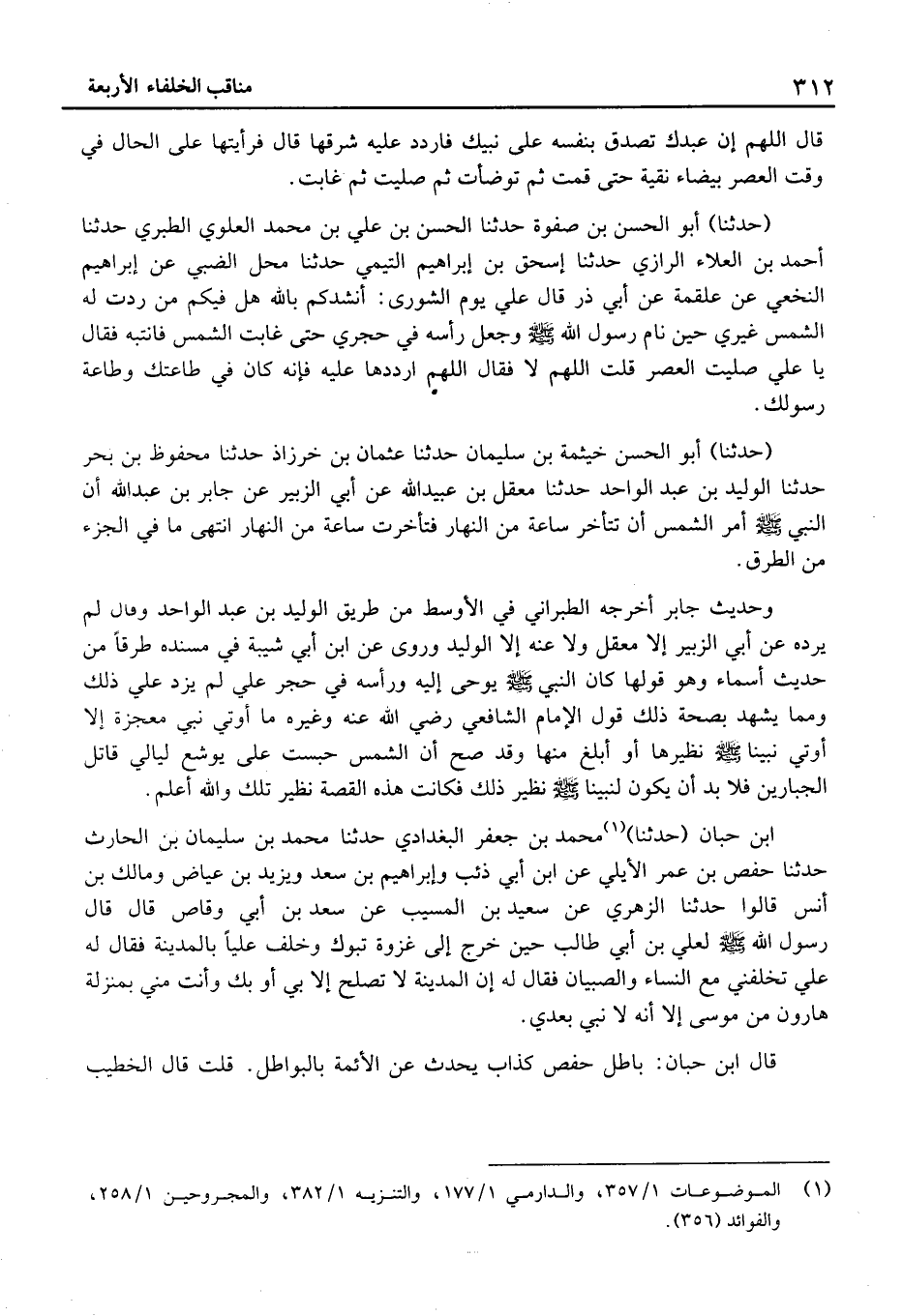 (حَدَّثَنَا) أَبُو الْحَسَن بْن صفوة حَدَّثَنَا الْحَسَن بْن عَلِيّ بْن مُحَمَّد الْعلوِي الطَّبَرِيّ حَدَّثَنَا أَحْمَد بْن الْعَلَاء الرَّازِيّ حَدَّثَنَا إِسْحَاق بْن إِبْرَاهِيم التَّيْمِيّ حَدَّثَنَا مَحل الضَّبِّيّ عَن إِبْرَاهِيم النَّخعِيّ عَن عَلْقَمَة عَنْ أَبِي ذَرٍّ قَالَ عَلِيٌّ يَوْمَ الشُّورَى: أَنْشُدُكُمْ بِاللَّهِ هَلْ فِيكُمْ مَنْ رُدَّتْ لَهُ الشَّمْسُ غَيْرِي حِين نَام رَسُول الله وَجَعَلَ رَأْسَهُ فِي حِجْرِي حَتَّى غَابَتِ الشَّمْسُ فَانْتَبَهَ فَقَالَ يَا عَلِيُّ صَلَّيْتَ الْعَصْرَ قُلْتُ اللَّهُمَّ لَا فَقَالَ اللَّهُمَّ ارْدُدْها عَلَيْهِ فَإِنَّهُ كَانَ فِي طَاعَتِكَ وَطَاعَةِ رَسُولِكَ.