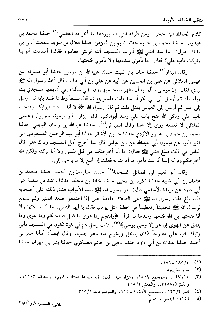 وَقَالَ الْبَزَّار حَدَّثَنَا حاتِم بْن اللَّيْث حَدَّثَنَا عُبَيْد الله بْن مُوسَى حَدَّثَنَا أَبُو مَيْمُونَة عَن عِيسَى الْملَائي عَن عَلِيّ بْن الْحُسَيْن عَن أَبِيهِ عَنْ عَلِيِّ بْنِ أَبِي طَالِبٍ قَالَ أَخَذَ رَسُولُ اللَّهِ بِيَدِي فَقَالَ: إِنَّ مُوسَى سَأَلَ رَبَّهُ أَنْ يُطَهِّرَ مَسْجِدَهُ بِهَارُونَ وَإِنِّي سَأَلْتُ رَبِّي أَنْ يُطَهِّرَ مَسْجِدِي بِكَ وَبِذُرِّيَّتِكَ ثُمَّ أَرْسَلَ إِلَى أَبِي بَكْرٍ أَنْ سُدَّ بَابَكَ فَاسْتَرْجَعَ ثُمَّ قَالَ سَمْعًا وَطَاعَةً فَسَدَّ بَابَهُ ثُمَّ أَرْسَلَ إِلَى عُمَرَ ثُمَّ أَرْسَلَ إِلَى الْعَبَّاسِ بِمِثْلِ ذَلِكَ ثُمَّ قَالَ رَسُول الله لَا أَنَا سَدَدْتُ أَبْوَابَكُمْ وَفَتَحْتُ بَابَ عَلِيٍّ وَلَكِنَّ اللَّهَ فَتَحَ بَابَ عَلِيٍّ وَسَدَّ أَبْوَابَكُمْ.