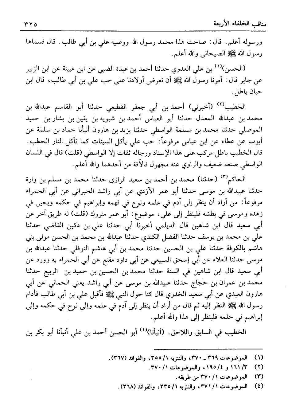 الْخَطِيب (أَخْبرنِي) أَحْمَد بْن أَبِي جَعْفَر الْقطيعِي حَدَّثَنَا أَبُو الْقَاسِم عَبْد الله بْن مُحَمَّد بْن عَبْد الله الْمعدل حَدَّثَنَا أَبُو الْعَبَّاس أَحْمَد بْن شبويه بْن يَقِين بْن بشار بْن حميد الْمَوْصِليّ حَدَّثَنَا مُحَمَّد بْن مسلمة الوَاسِطِيّ حَدَّثَنَا يزِيد بْن هَارُون أَنْبَأنَا حمّاد بْن سَلمَة عَن أَيُّوب عَن عَطاء عَنِ ابْنِ عَبَّاسٍ مَرْفُوعًا: حُبُّ عَلِيٍّ يَأْكُلُ السَّيِّئَاتِ كَمَا تَأْكُلُ النَّارَ الْحَطَبَ.