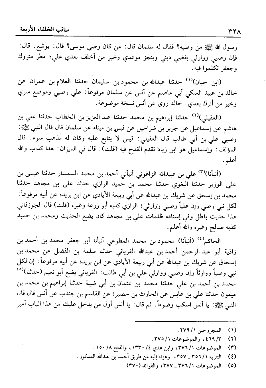 الْحَاكِم (أَنْبَأنَا) مَحْمُود بْن مُحَمَّد المطوعي أَنْبَأنَا أَبُو جَعْفَر مُحَمَّد بْن أَحْمَد بن زاذية أَبُو عَبْد الرَّحْمَن أَحْمَد بْن عبد الله الْفِرْيَانِيُّ حَدَّثَنَا سَلمَة بْن الْفضل عَن مُحَمَّد بْن إِسْحَاق عَن شريك بْن عَبْد الله عَنْ أَبِي ربيعَة الْإِيَادِي عَن ابْن بُرَيْدَة عَن أَبِيهِ مَرْفُوعا: إِنَّ لِكُلِّ نَبِيٍّ وَصِيًّا وَوَارِثًا وَإِنَّ وَصِيِّي وَوَارِثِي عَلِيُّ بْنُ أَبِي طَالِبٍ: الْفِرْيَانِيُّ يضعُ أَبُو نُعَيْم (حَدَّثَنَا) مُحَمَّد بْن أَحْمَد بْن عَليّ حَدَّثَنَا مُحَمَّد بْن عُثْمَان بْن أَبِي شيبَة حَدَّثَنَا إِبْرَاهِيم بْن مُحَمَّد بْن مَيْمُون حَدَّثَنَا عَلِيّ بْن عَابس عَن الْحَارِث بْن حصيرة عَن الْقَاسِم بْن جُنْدُب عَنْ أنس قَالَ قَالَ النَّبِي: يَا أَنَسُ اسْكُبْ وَضُوءًا.