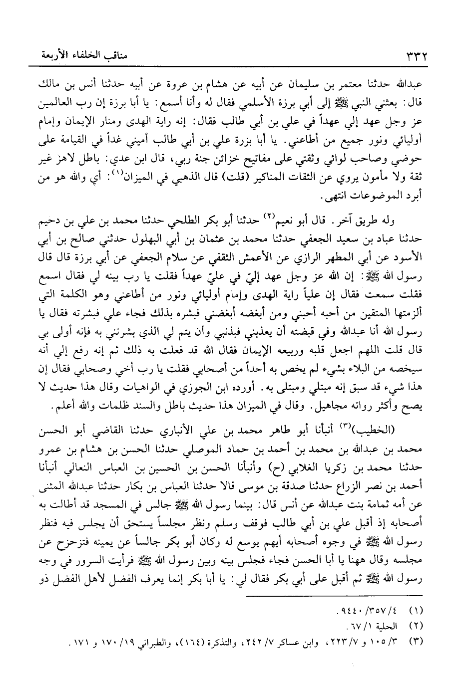 عَبْد الله حَدَّثَنَا مُعْتَمر بْن سُلَيْمَان عَن أَبِيهِ عَن هِشَام بْن عُرْوَة عَن أَبِيهِ حَدَّثَنَا أَنَسُ بْنُ مَالِكٍ قَالَ: بَعَثَنِي النَّبِي إِلَى أَبِي بَرْزَةَ الأَسْلَمِيِّ فَقَالَ لَهُ وَأَنَا أَسْمَعُ: يَا أَبَا بَرْزَةَ إِنَّ رَبَّ الْعَالَمِينَ عَزَّ وَجَلَّ عَهِدَ إِلَيَّ عَهْدًا فِي عَلِيُّ بْنُ أَبِي طَالِبٍ فَقَالَ: إِن رَايَةُ الْهُدَى وَمَنَارُ الإِيمَانِ وَإِمَامُ أَوْلِيَائِي وَنُورُ جَمِيعِ مَنْ أَطَاعَنِي.