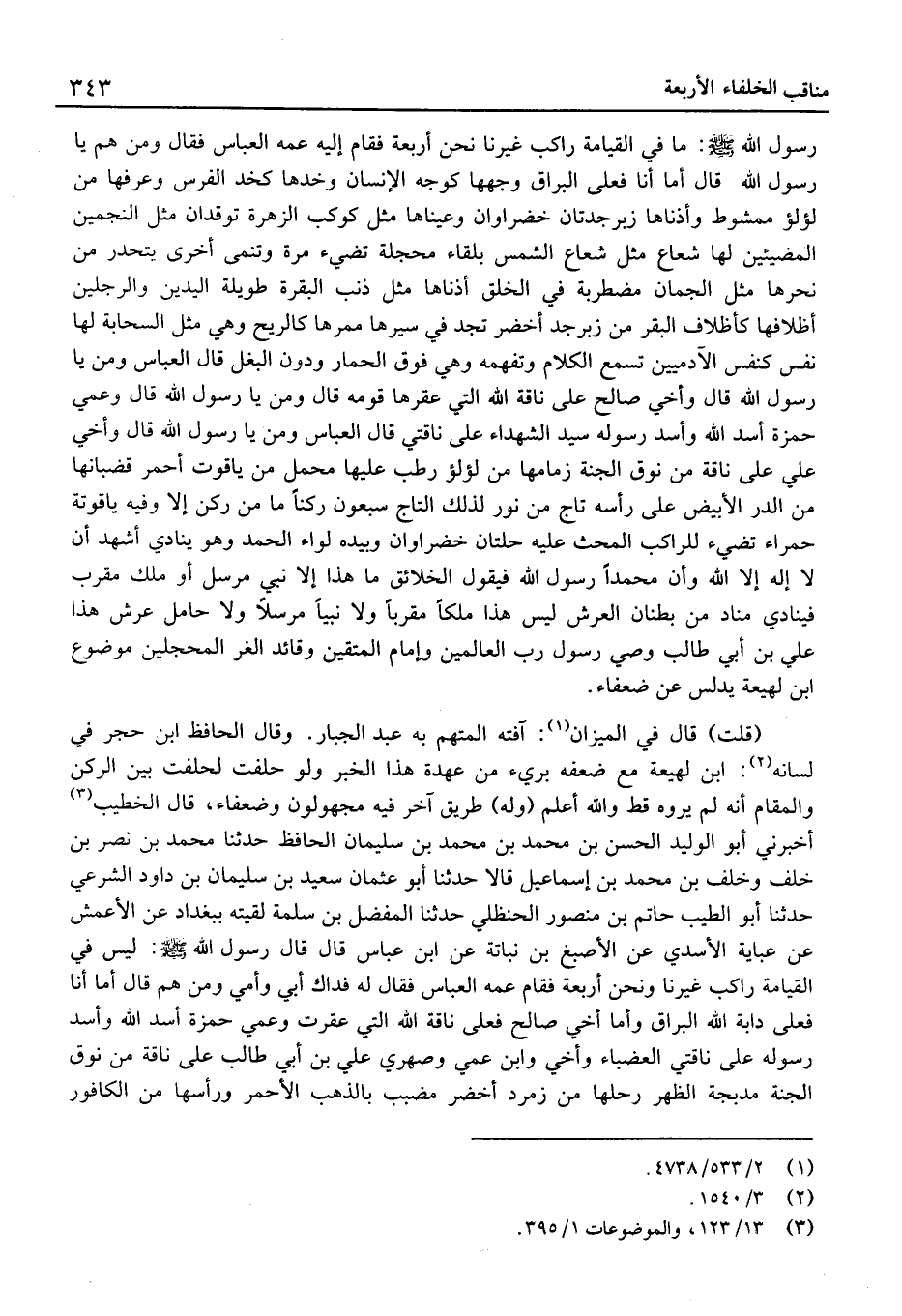 رَسُول الله: مَا فِي الْقِيَامَةِ رَاكِبٌ غَيْرُنَا نَحن أَرْبَعَة فَقَالَ إِلَيْهِ عَمُّهُ الْعَبَّاسُ فَقَالَ وَمَنْ هُمْ يَا رَسُولَ اللَّهِ قَالَ أَمَّا أَنَا فَعَلَى الْبُرَاقِ وَجْهُهَا كَوَجْهِ الإِنْسَانِ وَخَدُّهَا كَخَدِّ الْفَرَسِ وَعُرْفُهَا مِنْ لُؤْلُؤٍ مَمْشُوطٍ وَأُذُنَاهَا زَبَرْجَدَتَانِ خَضْرَاوَانِ وَعَيْنَاهَا مِثْلُ كَوْكَبِ الزُّهَرَةِ تُوقَدَانِ مِثْلَ النَّجْمَيْنِ الْمُضِيئَيْنِ لَهَا شُعَاعٌ مِثْلُ شُعَاعِ الشَّمْسِ بَلْقَاءُ مُحَجَّلَةٌ تُضِيءُ مَرَّةً وَتَنْمِي أُخْرَى يَتَحَدَّرُ مِنْ نَحْرِهَا مِثْلُ الْجُمَانِ مُضْطَرِبَةٌ فِي الْخَلْقِ أُذُنَاهَا مِثْلُ ذَنَبِ الْبَقَرَةِ طَوِيلَةُ الْيَدَيْنِ وَالرِّجْلَيْنِ أَظْلافُهَا كَأَظْلافِ الْبَقَرِ مِنْ زَبَرْجَدٍ أَخْضَرَ تَجِدُّ فِي سَيْرِهَا مَمَرُّهَا كَالرِّيحِ وَهِيَ مِثْلُ السَّحَابَةِ لَهَا نَفْسُ كَنَفس الآدَمِيِّينَ تَسْمَعُ الْكَلامَ وَتَفْهَمُهُ وَهِيَ فَوْقَ الْحِمَارِ وَدُونَ الْبَغْلِ قَالَ الْعَبَّاسُ وَمَنْ يَا رَسُولَ اللَّهِ قَالَ وَأَخِي صَالِحٌ عَلَى نَاقَةِ اللَّهِ الَّتِي عَقَرَهَا قَوْمُهُ قَالَ وَمَنْ يَا رَسُولَ اللَّهِ قَالَ وَعمي حَمْزَة أَسد الله وَأسد رَسُوله سيد الشُّهَدَاء على نَاقَتي قَالَ الْعَبَّاس وَمَنْ يَا رَسُولَ اللَّهِ قَالَ وَأَخِي عَليّ عَلَى نَاقَةٍ مِنْ نُوقِ الْجَنَّةِ زِمَامُهَا مِنْ لُؤْلُؤٍ رَطْبٍ عَلَيْهَا مَحْمَلٌ مِنْ يَاقُوتٍ أَحْمَرَ قُضْبَانُهَا مِنَ الدُّرِّ الأَبْيَضِ عَلَى رَأْسِهِ تَاجٌ مِنْ نُورٍ لِذَلِكَ التَّاجِ سَبْعُونَ رُكْنًا مَا مِنْ رُكْنٍ إِلا وَفِيهِ يَاقُوتَةٌ حَمْرَاءُ تُضِيءُ لِلرَّاكِبِ الْمُحِثِّ عَلَيْهِ حُلَّتَانِ خَضْرَاوَانِ وَبِيَدِهِ لِوَاءُ الْحَمْدِ وَهُوَ يُنَادِي أَشْهَدُ أَنْ لَا إِلَهَ إِلا اللَّهُ وَأَنَّ مُحَمَّدًا رَسُولُ اللَّهِ فَيَقُولُ الْخَلائِقُ مَا هَذَا إِلا نَبِيٌّ مُرْسَلٌ أَوْ مَلَكٌ مُقَرَّبٌ فَيُنَادِي مُنَادٍ مِنْ بُطْنَانِ الْعَرْشِ لَيْسَ هَذَا مَلَكًا مُقَرَّبًا وَلا نَبِيًّا مُرْسَلا وَلا حَامِلَ عَرْشٍ هَذَا عَلِيُّ بْنُ أَبِي طَالِبٍ وَصِيُّ رَسُولِ رَبِّ الْعَالَمِينَ وَإِمَامُ الْمُتَّقِينَ وَقَائِدُ الْغُرِّ الْمُحَجَّلِينَ مَوْضُوع ابْن لَهِيعَة يُدَلس عَن ضعفاء.