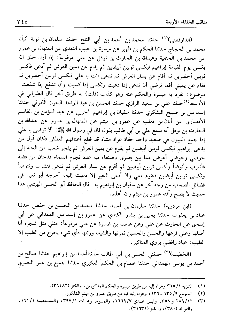 (الدَّارَقُطْنِيّ) حَدَّثَنَا مُحَمَّد بْن أَحْمَد بْن أبي الثَّلج حَدَّثَنَا سُلَْمَان بْن نوبَة أَنْبَأنَا مُحَمَّد بْن الْحجَّاج حَدَّثَنَا الحكم بْن ظهير عَن ميسرَة بْن حبيب النَّهْدِيّ عَن الْمنْهَال بْن عَمْرو عَن مُحَمَّد بْن الْحَنَفِيَّة وَعبد الله بْن الْحَارِث بْن نَوْفَل عَن عَلِيٍّ مَرْفُوعا: أِنَّ أَوَّلَ خَلْقِ اللَّهِ يُكْسَى يَوْمَ الْقِيَامَةِ إِبْرَاهِيمُ فَيُكْسَى ثَوْبَيْنِ أَبْيَضَيْنِ ثُمَّ يُقَامُ عَنْ يَمِينِ الْعَرْشِ ثمَّ أدعى فأكسى ثَوْبَيْنِ أخضرين ثمَّ أَقَامَ عَن يسَار الْعَرْش ثُمَّ تُدْعَى أَنْتَ يَا عَلِيُّ فَتُكْسَى ثَوْبَيْنِ أَخْضَرَيْنِ ثُمَّ تُقَامُ عَنْ يَمِينِي أَفَمَا تَرْضَى أَنْ تُدْعَى إِذَا دُعِيتُ وَتُكْسَى إِذَا كُسِيتُ وَأَنْ تُشَفَّعَ إِذَا شُفِّعْتُ.
